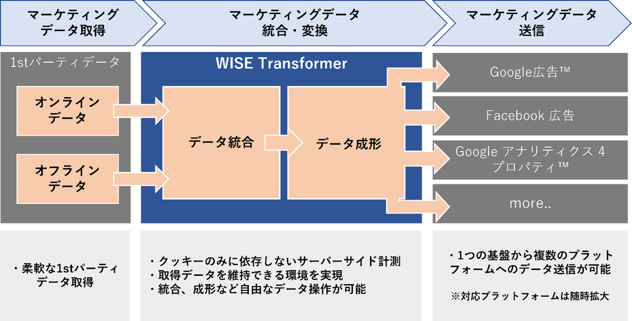 「WISE Transformer」は、Google™のタグ管理ツールGoogleタグマネージャーのサーバーサイドコンテナ™(※3)の利用により、サーバー内で1st パーティ データを活用・管理ができる、1st パーティデータ活用基盤です。ITPの影響を回避できると同時に、ユーザーのプライバシー保護と、企業の効果的なデジタルマーケティング活動の両立を実現します。