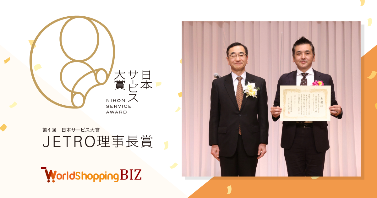 2022年12月6日に行われた「第4回日本サービス大賞」において、株式会社ジグザグが運営する「WorldShopping BIZ」は、越境ECを始める際に必要なスキームをシンプルかつ包括的サポートしている点、グローバル化の促進に大きく貢献している点を評価いただき「JETRO理事長賞」を受賞いたしました。
