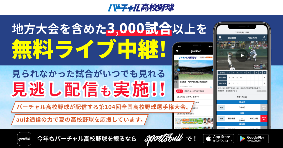 株式会社朝日新聞社(本社:東京都中央区、代表取締役社長:中村 史郎、以下 朝日新聞社)と朝日放送テレビ株式会社(本社:大阪府大阪市、代表取締役社長:山本 晋也)は、KDDI株式会社(本社:東京都千代田区、代表取締役社長:髙橋 誠、以下 KDDI)の協力のもと、株式会社運動通信社(本社:東京都港区、代表取締役社長:黒飛 功二朗)が運営するスポーツメディア「SPORTS BULL(スポーツブル)」内で展開する「バーチャル高校野球」(https://vk.sportsbull.jp/koshien/)にて、第104回全国高校野球選手権大会(主催:朝日新聞社、日本高等学校野球連盟)のライブ中継を実施します。