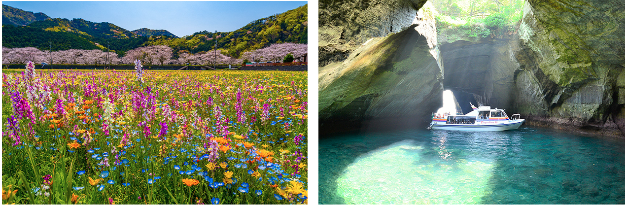左:田んぼを使ったお花畑。明るい色合いの花が咲き乱れ、暖かな西伊豆の空気と共に春の訪れを全身で感じていただけるスポット。