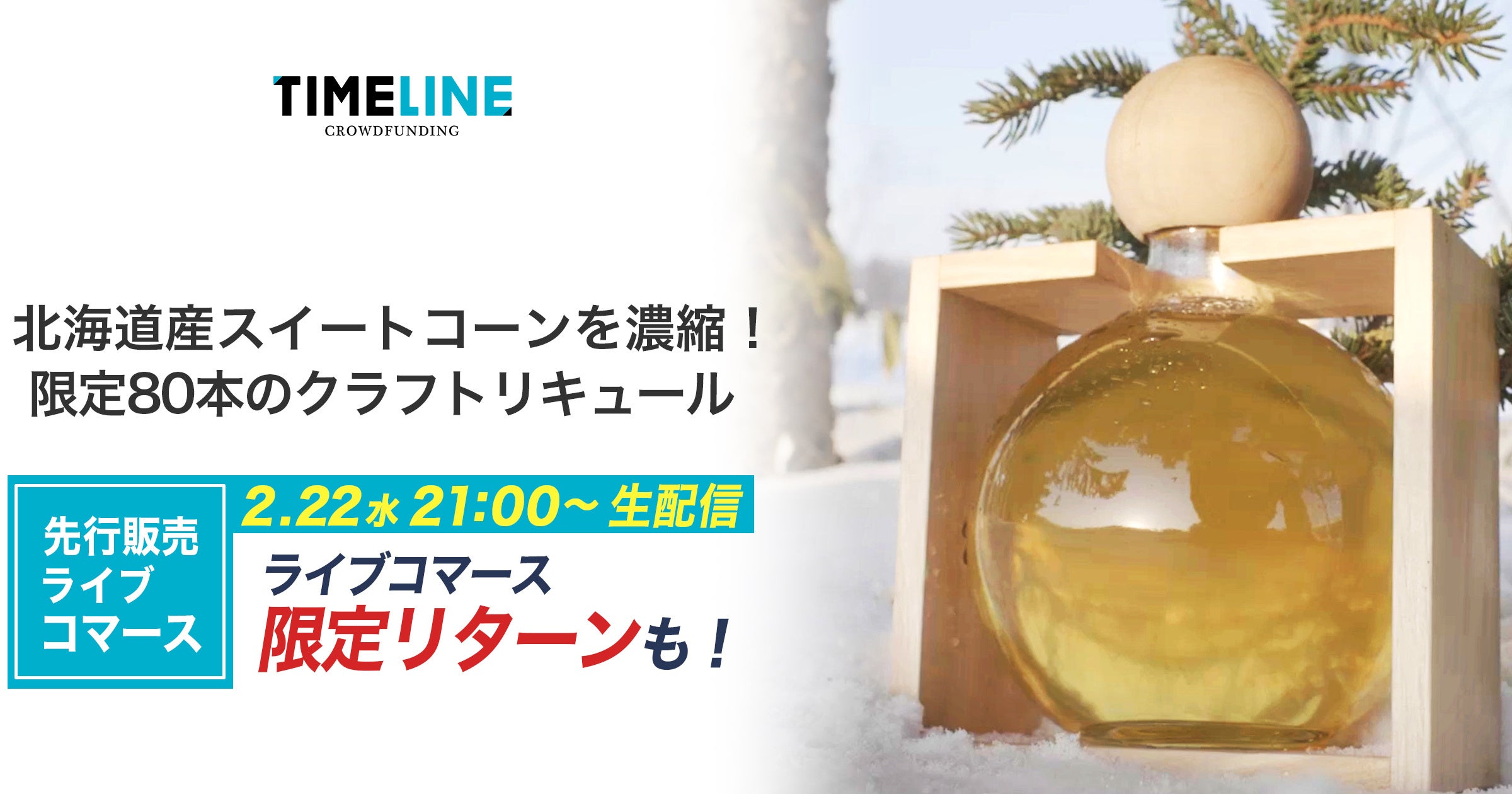『TIMELINEクラウドファンディング』ライブコマース番組第2弾は、2/22(水)21:00〜 北海道産スイートコーン140本を濃縮したクラフトリキュールをご紹介