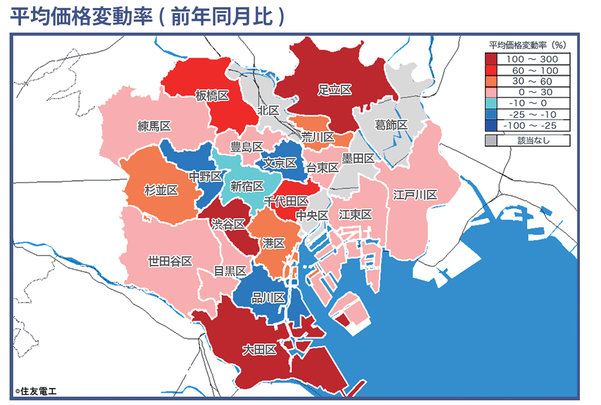 地図の各行政区ごとの色の違いは、同行政区における平均価格の前年同月比(平均価格変動率)の程度を表しています。