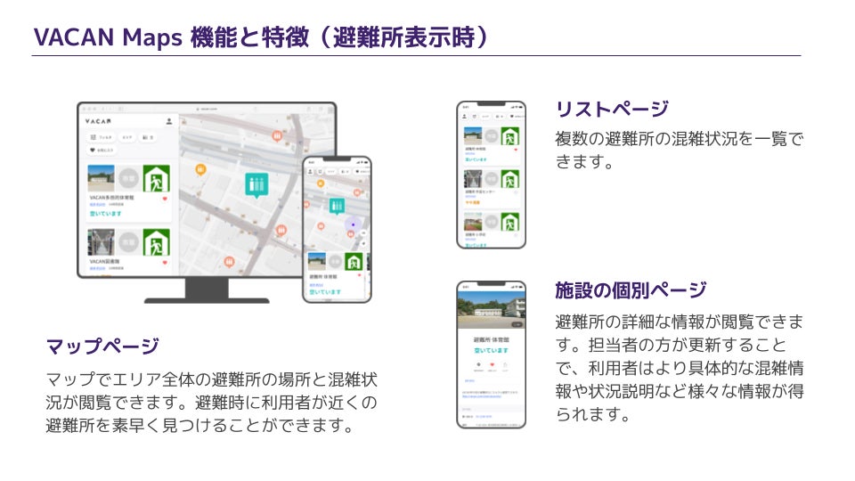 VACANには、マップ上で近くの施設等の空き・混雑状況を一覧できる「VACAN Maps」(https://vacan.com)という機能があり、避難される方はこのVACAN MapsにPCやスマートフォン等でアクセスすることで、各避難所の位置や混み具合を確認することができます。混み具合の情報は、各避難所の職員等がインターネット上の管理画面から操作することで更新します。表示は、「closed」「開設可能」「空いています」「やや混雑」「混雑」の5段階で運用されます。