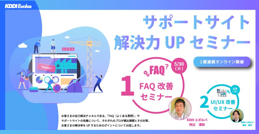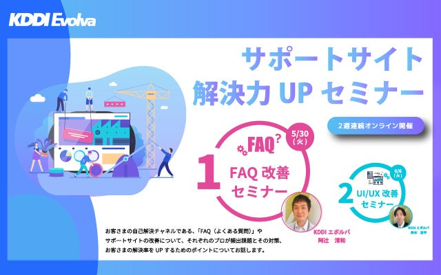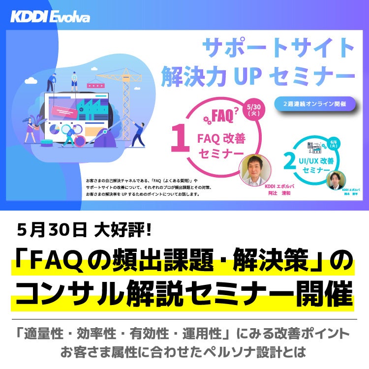 お客さま満足につながる重要な自己解決手段であるカスタマーサポートサイトについて、KDDIエボルバのコンサルタントが「アクセスのしやすさ」「サイトの使いやすさ」「目標達成のしやすさ」の3つの観点から分析、具体的な改善のポイントについて、実際の改善事例とその結果を交えてお話しいたします。FAQ改善セミナーとあわせて、ぜひご参加くださいませ。
