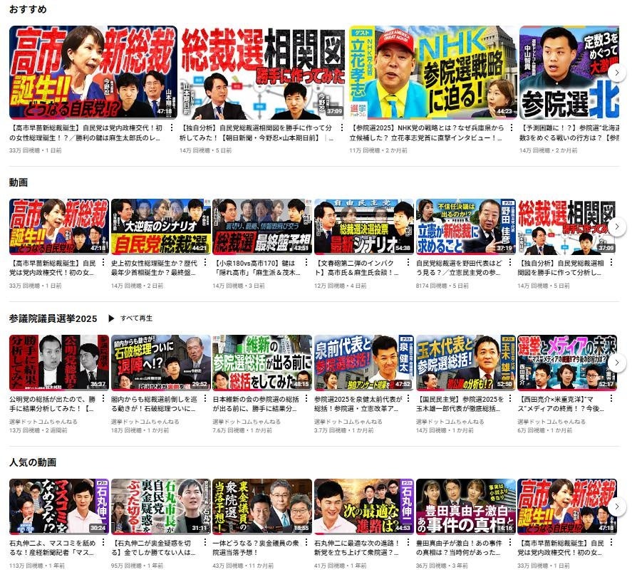 「選挙ドットコムちゃんねる」は2019年11月、現在の番組構成でスタートしました。現在では毎週火~日曜日の午後6時以降に公開する通常放送に加え、国政選挙などの大型選挙などにあわせた「特番」、「自民党総裁選2024」では「候補者討論会」を実施、「2025年参院選」では「党首討論」も実施してまいりました。