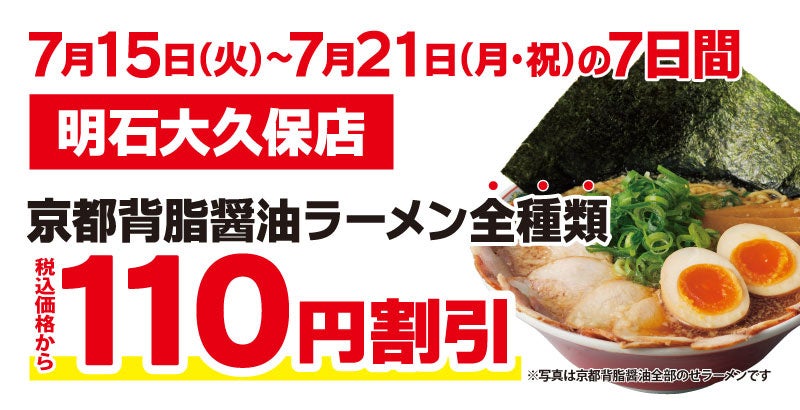 この度オープンを記念して、「明石大久保店」にご来店いただいたお客様には、『京都背脂醤油ラーメン全種類』を税込価格から110円割引で販売いたします。