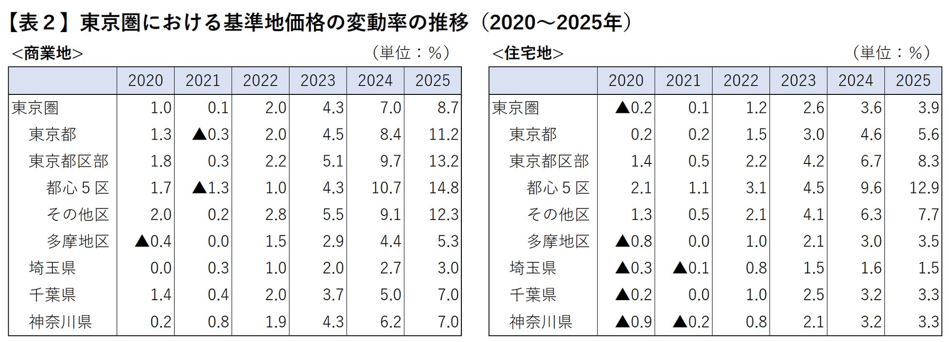 とくに都心5区では、2025年に商業地で14.8%(10.7%)上昇、住宅地で12.9%(9.6%)上昇であり、商業地、住宅地とも都心部の上昇率の高さが目立っています。