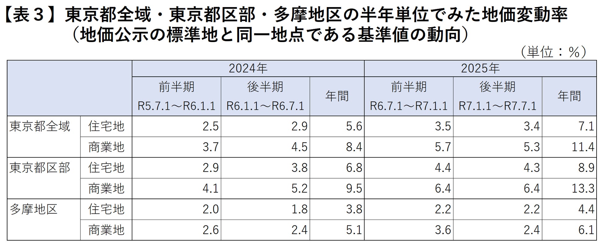 ただし、地価公示の標準地と同一地点である基準地(共通地点)で、2025年の前半期(2024年7月1日~2025年1月1日)と後半期(2025年1月1日~7月1日)に分けて地価変動率をみた場合、東京都全域における商業地は前半期5.7%上昇・後半期5.3%上昇、住宅地は前半期3.5%上昇・後半期3.4%上昇と、いずれも前半期に比べて後半期は上昇幅が縮小しています【表3】。