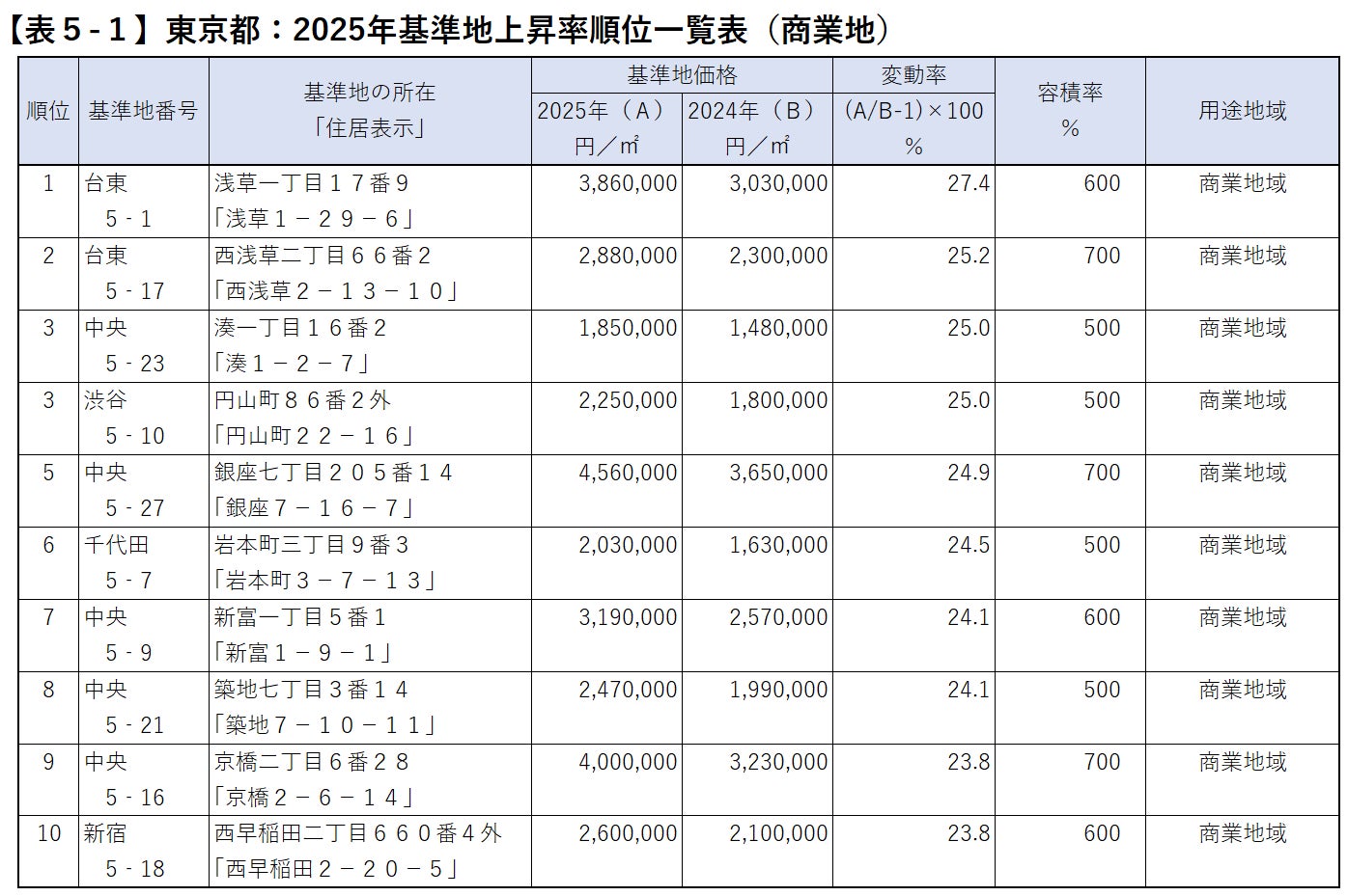 23区内の基準地(商業地)で上昇率がもっとも高かったのは、台東区浅草1丁目(27.4%上昇)で、2位は同区西浅草2丁目(25.2%上昇)です。浅草周辺はインバウンドを含めた観光客の増加により、店舗や飲食店の需要増加に加え、ホテル建設などが進んでいることが高い上昇率の要因と言えるでしょう。また、上位10位内に中央区が5地点ランクインしていますが、銀座や築地、京橋、新富町などの駅周辺でホテルやオフィスの需要が高いことを表しています【表5-1】。