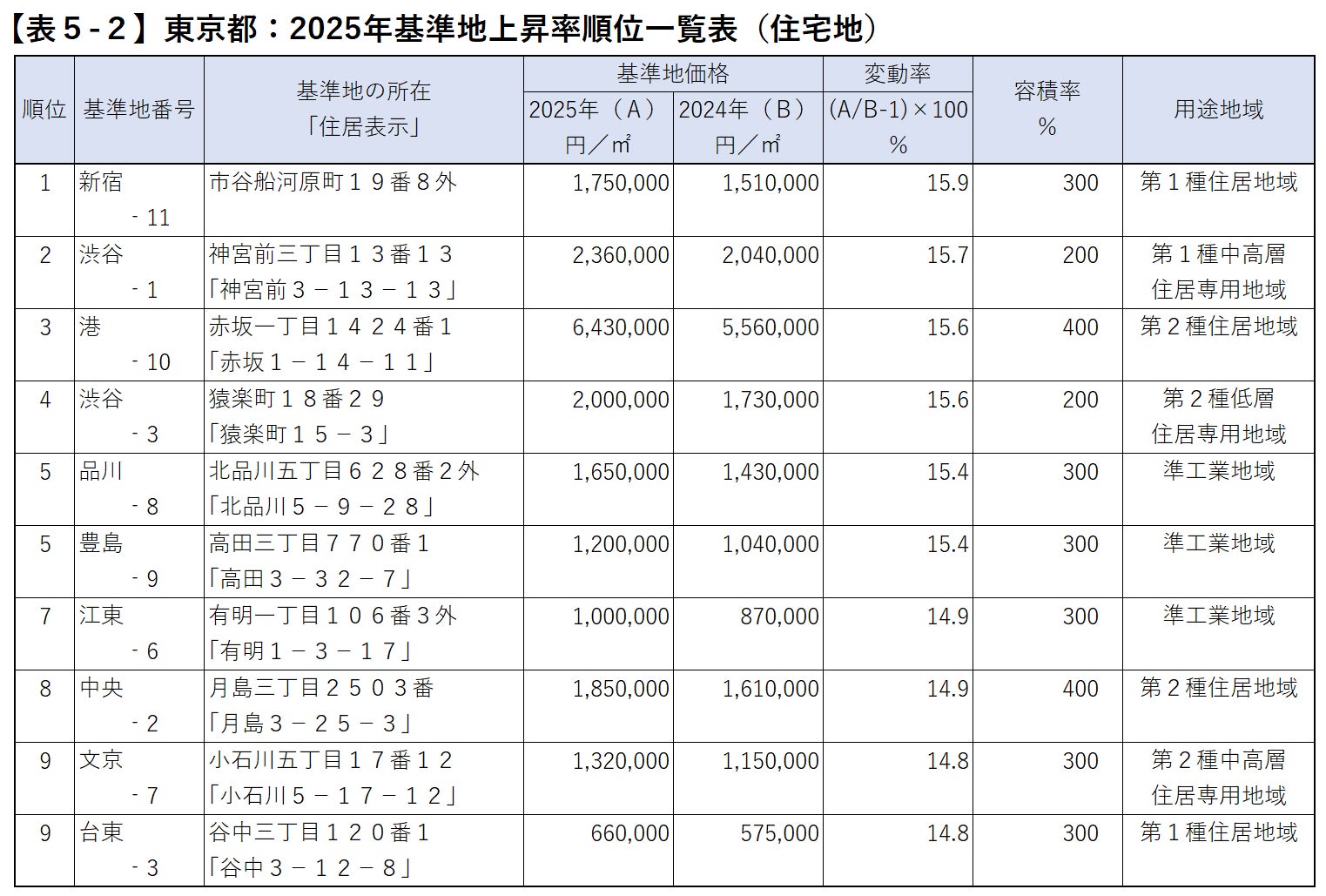 なお、23区内の基準地(住宅地)で上昇率がもっとも高かったのは、JR飯田橋駅と市ケ谷駅の間で神楽坂に隣接した新宿区市谷船河原町15.9%であり、渋谷区神宮前3丁目15.7%、港区赤坂1丁目15.6%が続いています。また、渋谷区猿楽町(代官山駅付近)や品川区北品川5丁目(御殿山付近)、豊島区高田3丁目(目白駅付近)、文京区小石川5丁目などの高級住宅街がやはり続く中で、江東区有明1丁目や中央区月島3丁目といった再開発が進む臨海部も上位に入っています【表5-2】。