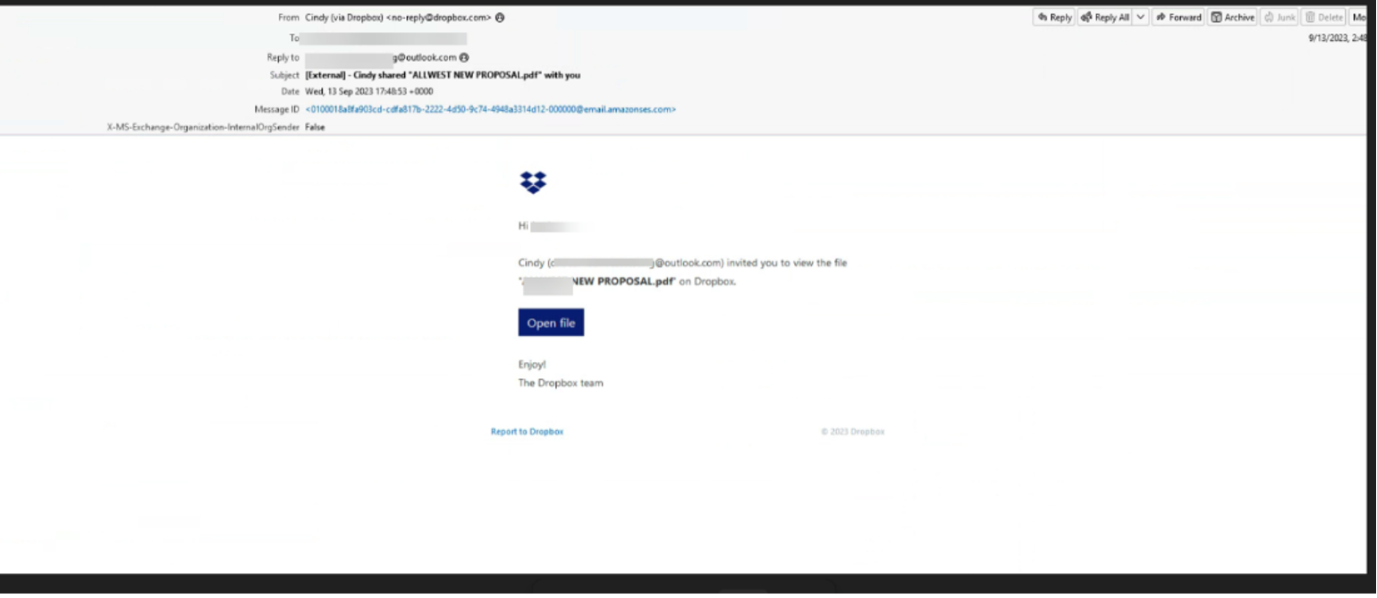 攻撃は、本物のDropboxから直接送られてくるメールから始まります。これは、誰でもDropboxから受け取る標準的なメールで、ドキュメントを閲覧する通知です。その後、ユーザーは正規のDropboxページに誘導されます。