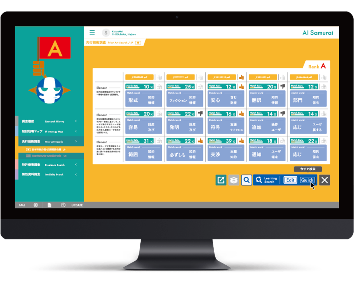 『AI Samurai®』は特許庁が公開する特許公開公報と特許公報をデータベース化し、類似する先⾏技術の事例から出願予定の特許の登録が成⽴する可能性をランク別に評価するAI特許審査シミュレーションシステムです。従来、数週間を要していた先⾏技術調査が数分で可能になる斬新なプロダクトとして2019年3⽉に第4回「JEITAベンチャー賞」(電⼦情報技術産業協会)を受賞しています。また、初めて使⽤する⽅でもすぐに操作できる直感的なインターフェイス、AIを擬⼈化したチャーミングなキャラクターについて2019年のグッドデザイン賞(公益財団法⼈⽇本デザイン振興会)を受賞しています。