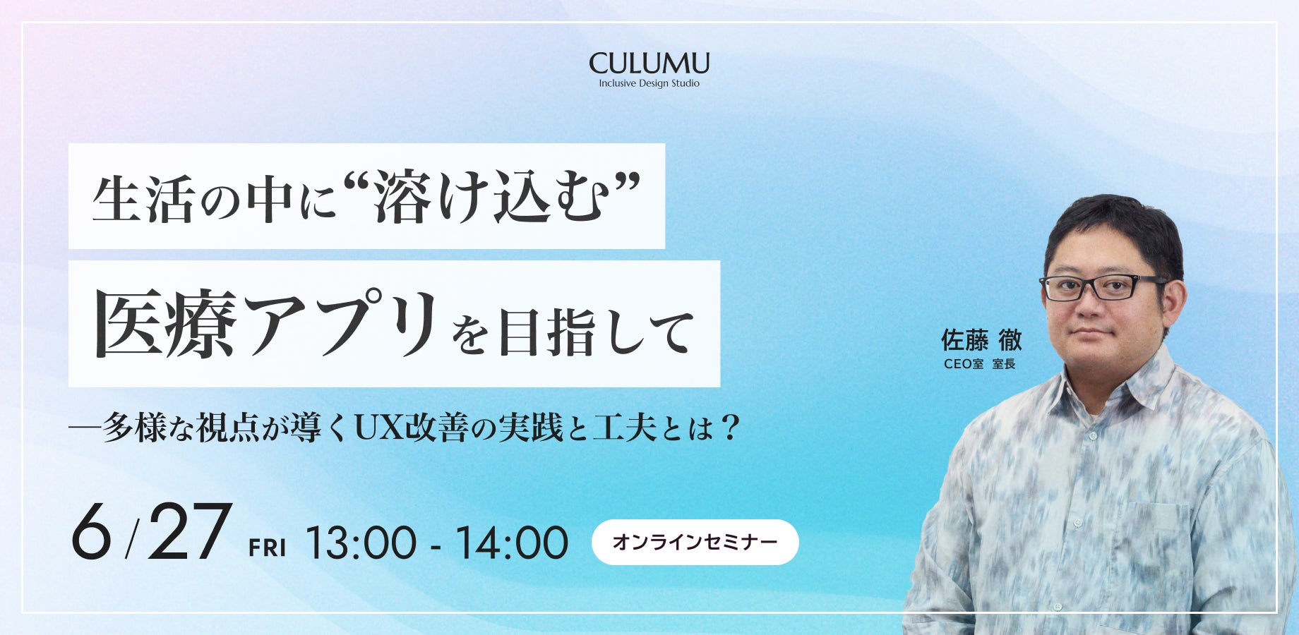 本セミナーでは、アクセシビリティ要件とUXの観点から、具体的なデザインポイントを分解しながら、視認性・操作性・理解性を高める方法を解説します。CULUMUが支援した医療アプリ開発事例をもとに、ユーザーリサーチからUI設計、改善評価までのプロセスを紹介。単に“使いやすい”を目指すのではなく、利用者が安心して生活を送れる状態=QOLの向上を支えるUXとは何か、その設計のヒントをお届けします。