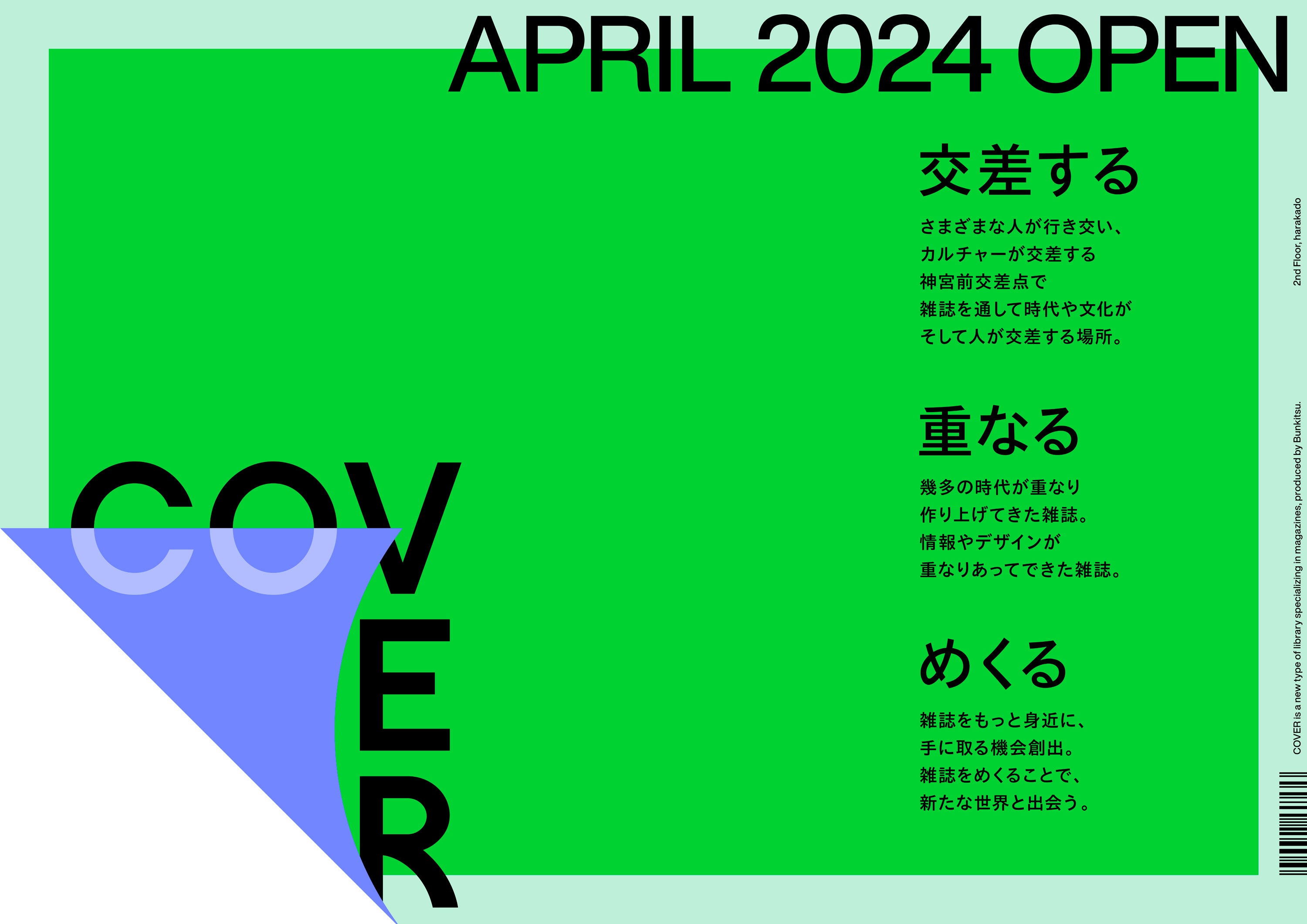 今回は、様々なカルチャーが集まり、流行の発信地として知られる原宿を舞台に、「雑誌をもっと身近に、手に取る機会を。」をテーマとして、雑誌アーカイブライブラリーをプロデュースします。雑誌はこれまでも、その時代のトレンドや文化を発信し、生活者の豊かな時間を形づくってきました。モノやサービスが溢れる今だからこそ、紙の雑誌を通して得られる情報や体験は、価値あるものだと私たちは考えます。原宿の地で、雑誌を起点に、生活者が豊かな時間を過ごせる拠り所のような場となることを目指して、「COVER」のプロデュースを行ってまいります。