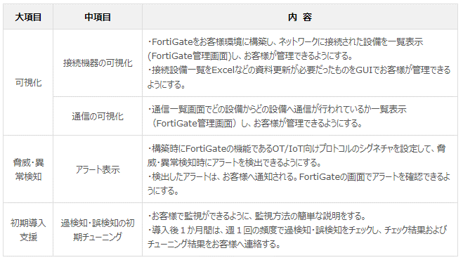 まずは、状況を把握(可視化)できるように、既存のOT/IoTネットワークに影響を与えることなく(お客様はミラーリングのパケットを送るように既存スイッチの設定のみで)導入いただくことが可能です。また、FortiGateを用いることで、シンプルな機能でお客様の負担なく、小規模な事業所へ提供することが可能です。