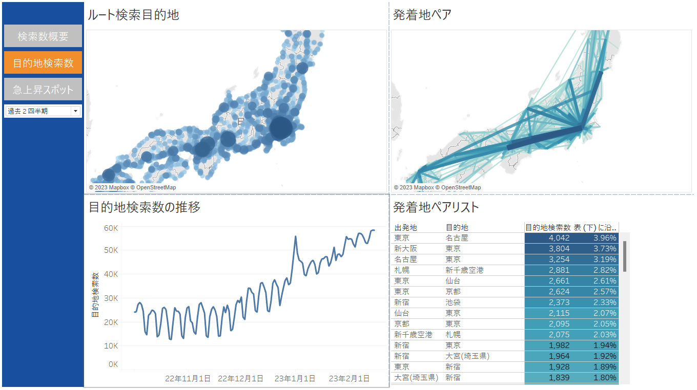 ルート検索目的地の伸び率、ルート検索目的地ランキング、目的地検索数の推移、ルート検索発着地ランキングを把握できる。