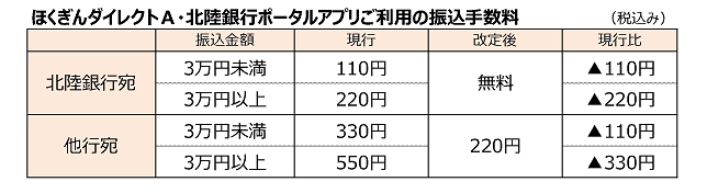 北陸銀行(頭取 庵 栄伸)は、2022年2月1日(火)より、ほくぎんダイレクトA・北陸銀行ポータルアプリ利用による振込手数料を改定することといたしましたのでお知らせいたします。