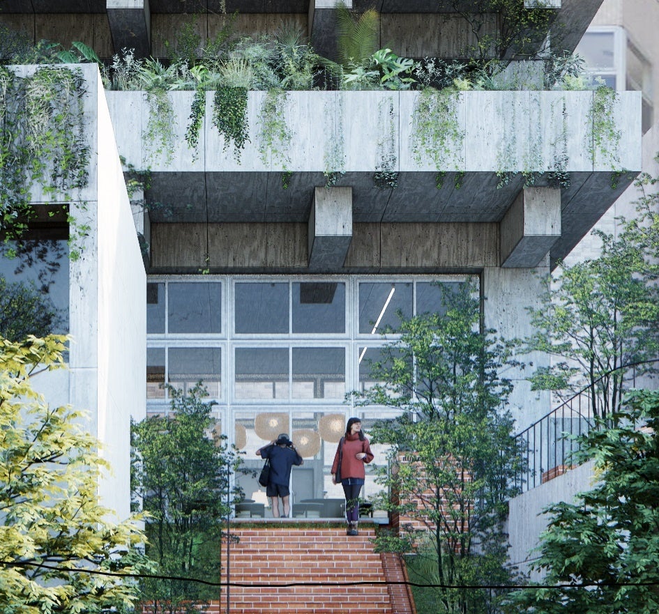 削ぎ落とされた木の幹や枝のように存在する構造体は、年月とともに豊かな緑が根づき、鳥や虫の住処となったり、視線や日射を遮る機能を担い心地よい環境を創出。都心の暮らしとは異なる体験や時間の流れが感じられる。
