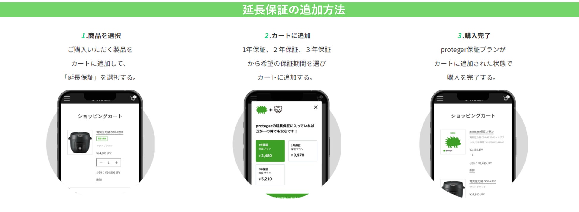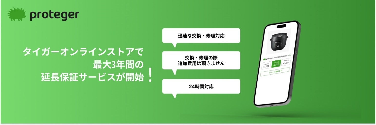 タイガーオンラインストアでは本日より、製品をより安心してお買い物いただくため、株式会社Kiva (東京都中央区、代表取締役:野尻 航太)が提供する延長保証サービス「proteger(プロテジャー)」を開始いたします。延長保証サービス「proteger」にご加入いただくと、大切な製品に万が一の破損等が起きた場合(自然故障が対象)に迅速に製品交換・修理が無償で受けられます。