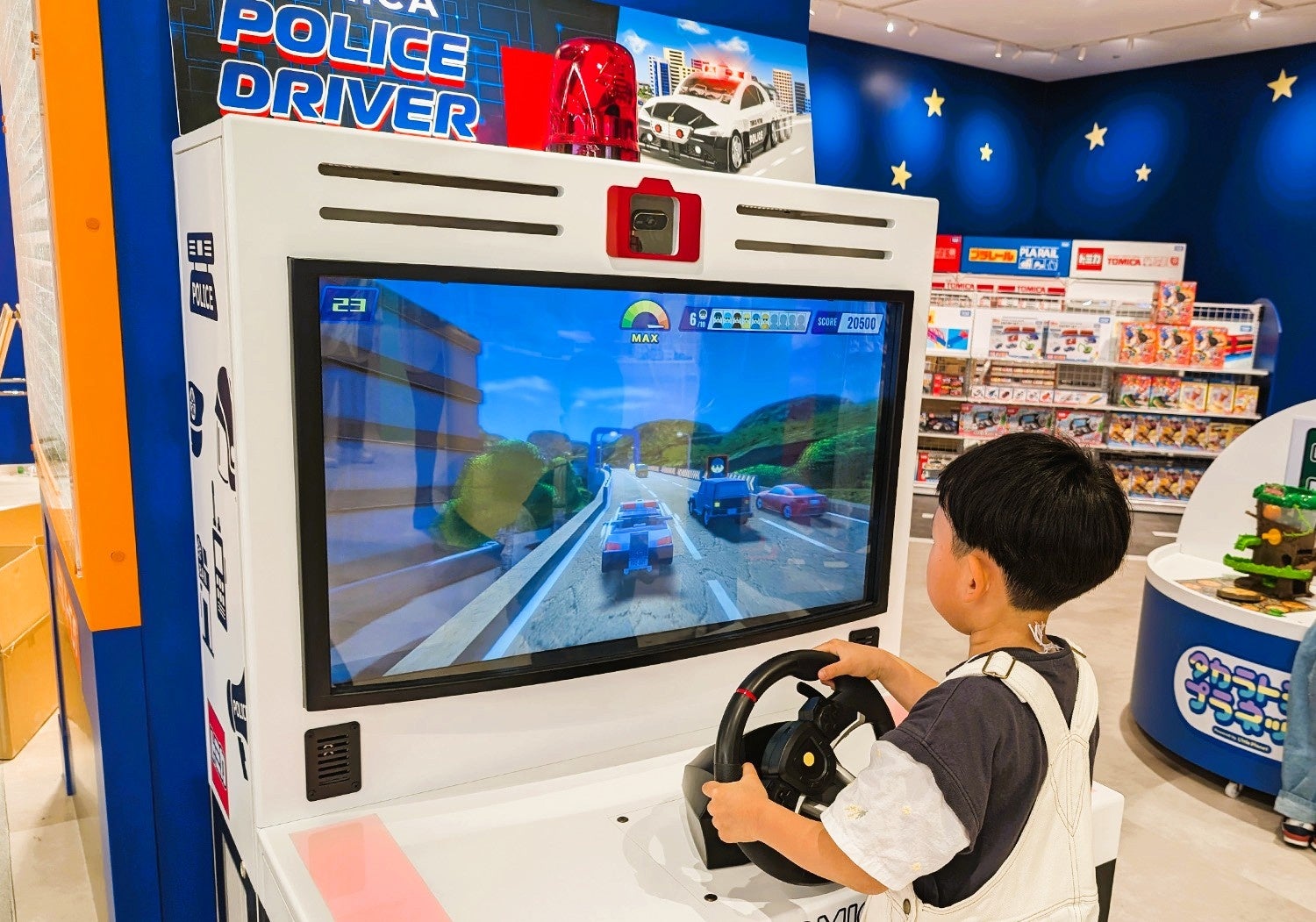 またショップ内では、国内初のコンテンツとして、トミカシリーズの人気のおもちゃ「ビッグに変形!デカパトロールカー」をイメージしたショップオリジナルアトラクション「トミカポリスドライバー」を展開します。プレイヤーはトミカパトロールチームの一員となり、街で起きた事件の犯人を追跡!専用のハンドル型コントローラーでパトカーを操作し、犯人の車を追いかけて捕まえるスリリングなミッションに挑戦します。「トミカポリスドライバー」は、体験1回(「ライセンスカード」1枚付き)とトミカ1台(※)がセットになったパッケージ(税込1,000円)でお楽しみいただけます。