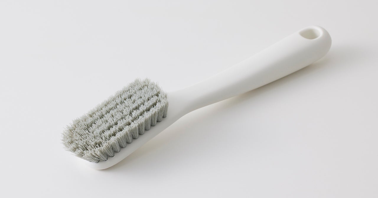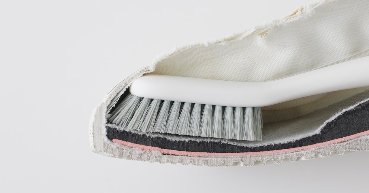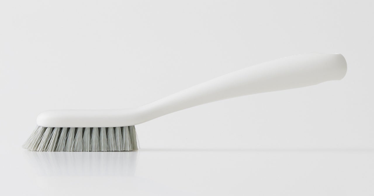 この度の「シューズブラシ」は、側面、底面、つま先と、靴の隅々まで洗いやすいブラシを目指しました。密度のある柔らかなブラシは、先端のみハリのある硬めの毛を配置。ピンポイントに狙って洗ってもへたりにくく、全体を洗う時にはほどよくしなって、カーブや細かい凹凸にフィットします。ヘッドは薄く先がラウンドしているので、狭いつま先までブラシがしっかり届きます。厚みのある柄は手にフィットし、力を入れやすい形状です。