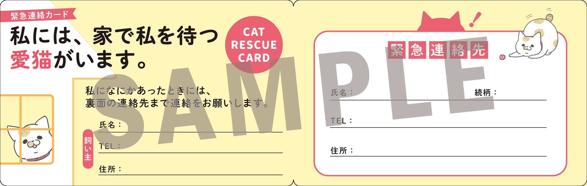 本書の発売を記念して、Amazon・楽天ブックスで購入した方を対象に特典をご用意しました。飼い主が外出中に自然災害や事故にあった際、おうちに大切な猫がいることを知らせる「緊急連絡カード』です。
