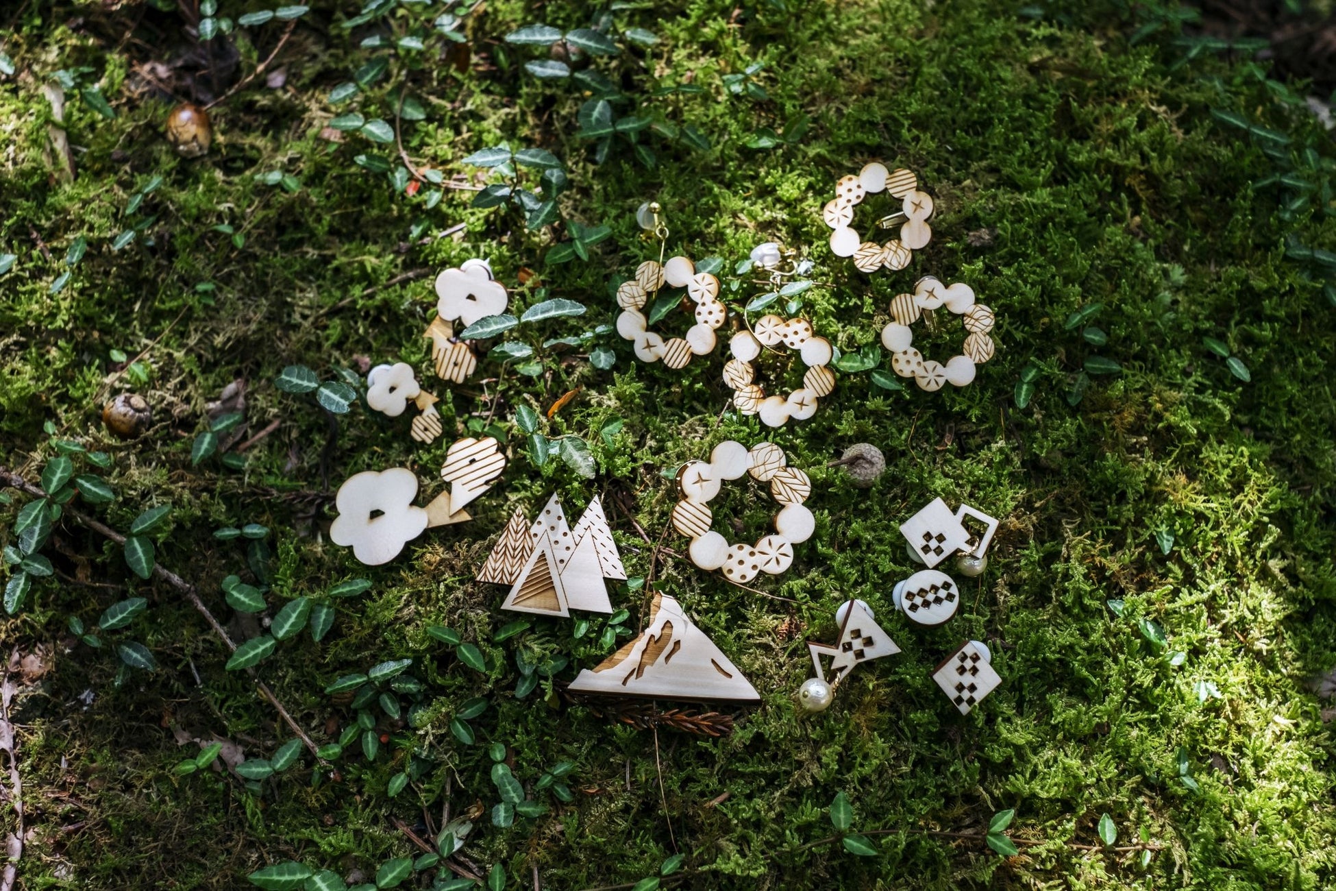 暮らしの中に森を。自ら森に入りながら、愛媛の木を使ってアクセサリーや日用品などをつくっています。無垢のヒノキやカエデなどの耳飾りやブローチ、ヘアアクセサリーはとても軽い付け心地でストレスなく着けられます。