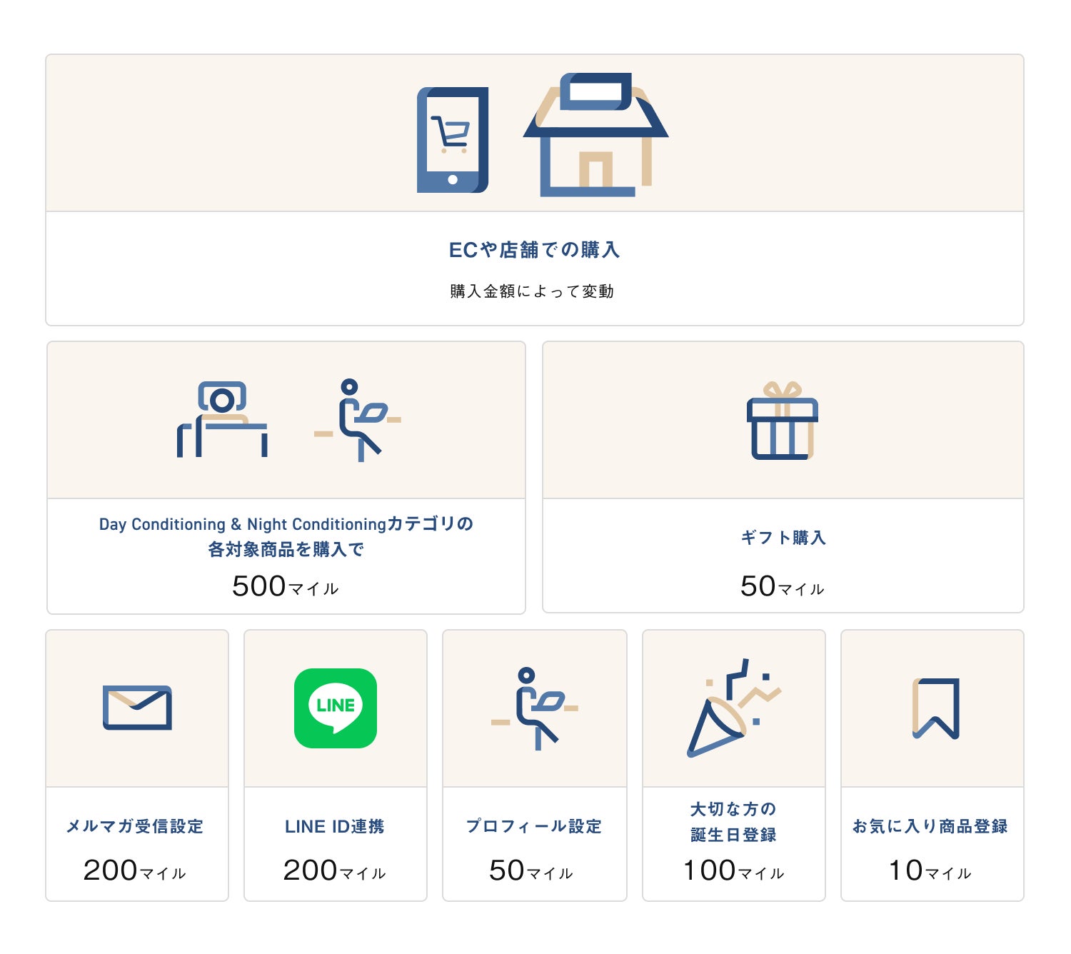 TENTIALマイルは商品の購入をはじめとする様々なアクションによって貯めることができ、1年間に獲得したマイルがお客様の会員ステージに反映されます。ご購入金額に対する3〜7%のマイル付与に加えて、ギフトでの購入(有料のみ)や、1年間のうちにNight ConditioningとDay Conditioningカテゴリーの商品を横断してご購入いただいた場合には特別に追加マイルが付与されます。