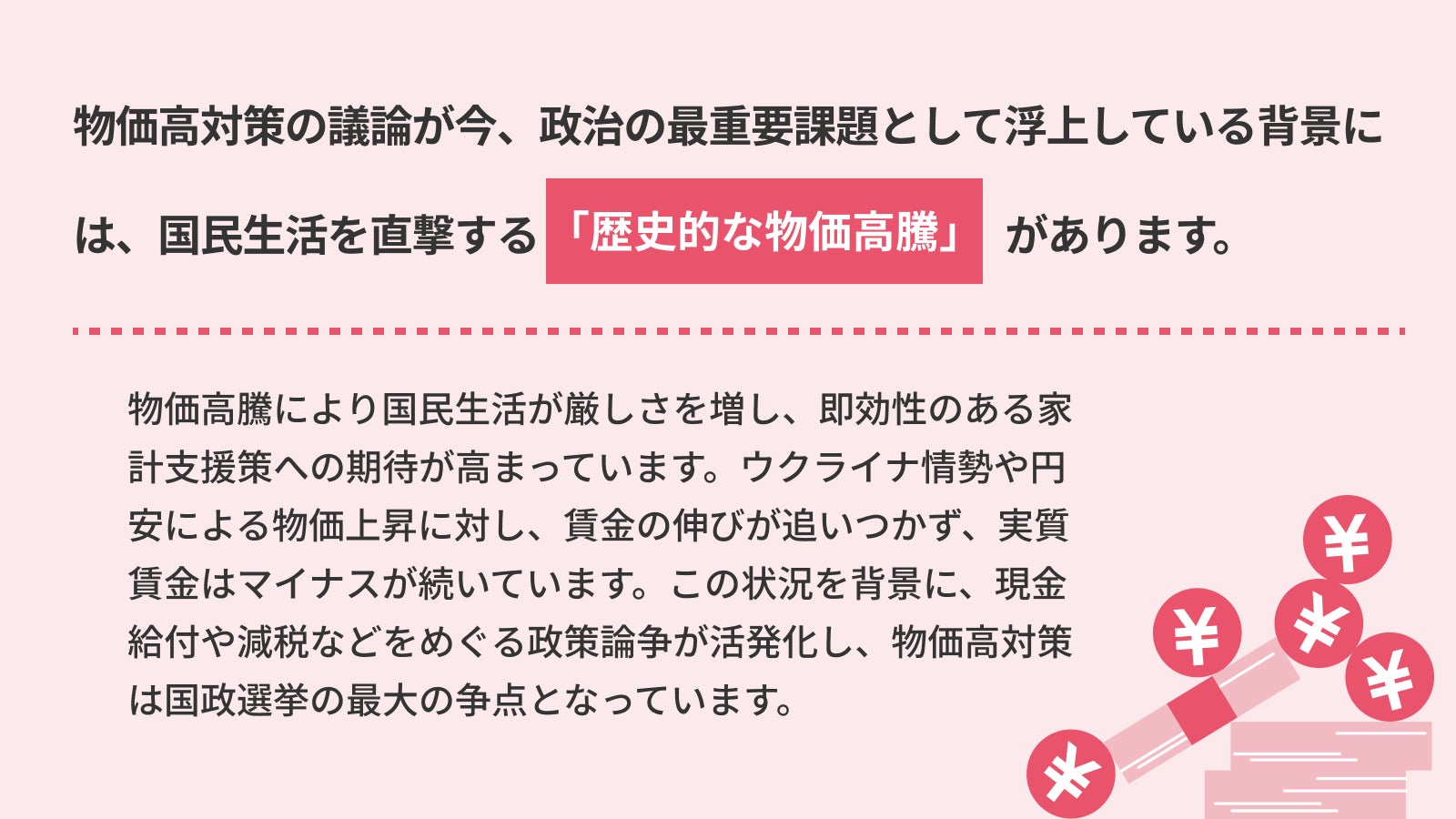 ウクライナ情勢や円安によって物価が上昇する一方で、実質賃金の伸びの遅れが指摘され、国民生活が厳しさを増しています。これに合わせて現金給付や減税などをめぐる政策論争が活発化し、物価高対策は次の参議院議員選挙の最大の争点となっています。持続可能で有効な制度設計を実現し、家計を支えるためにはどのような政策が必要なのか、政策議論を深める目的で意見募集を行います。