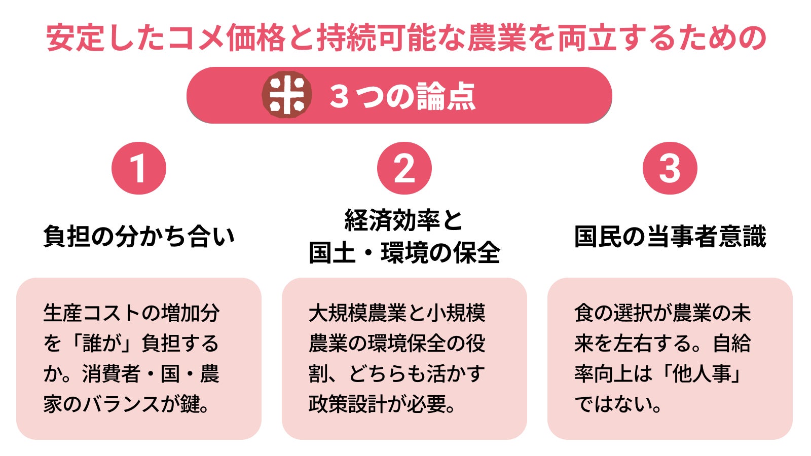 コメの価格高騰をきっかけとしてコメをめぐる政策に注目が集まっています。コメを取り巻く複合的な課題に対応し、安定したコメ価格と持続可能な農業を両立させるためにはどのような視点・政策が必要なのか政策議論を深める目的で、意見募集を行います。