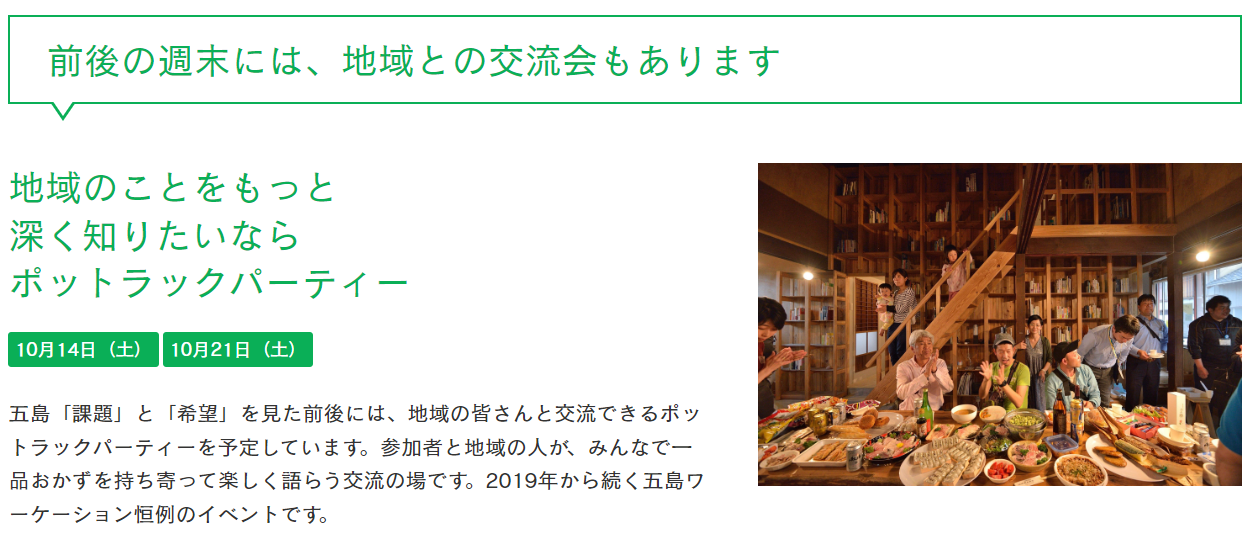 五島の「課題」と「希望」を見る前と見た後に、地域の皆さんと交流できるポットラックパーティー(持ち寄り型パーティ)の開催を予定しています。参加者と地域の人が一品おかずを持ち寄って楽しく語らう交流の場です。2019年から続く五島ワーケーション恒例のイベント。「地域への理解」を促進する機会として社会科見学とセットでの参加を推奨しています。