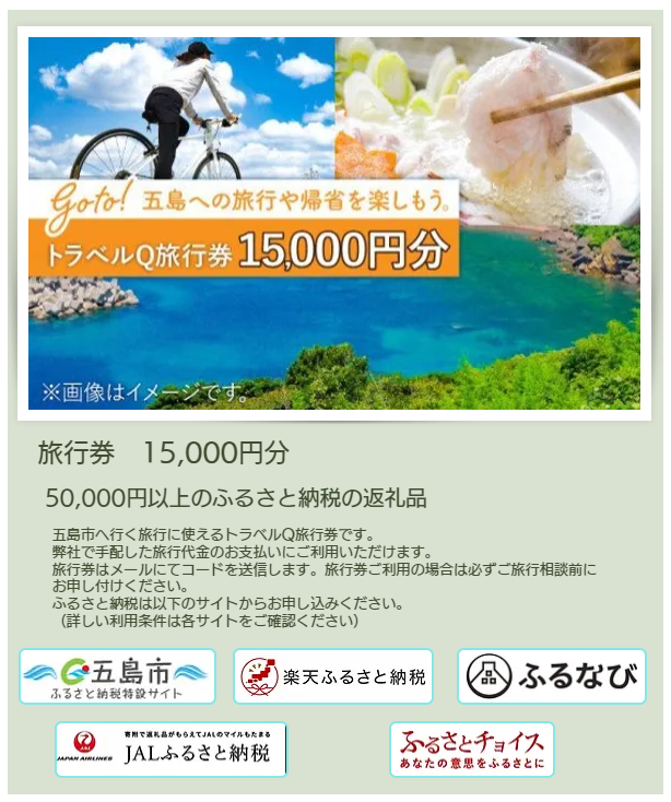 『「2040年の日本を体感しにいこう。2」五島列島タイムワープ・スタディ』にかかる参加費用の一部を、五島市へのふるさと納税制度を利用して支払うことができます。3000円分、9000円分、1万5000円分、3万円分、6万円分の5種類から選べます。今回以外にも、ワーケーションで五島を訪れる際にも利用可能なお得な旅行券です。