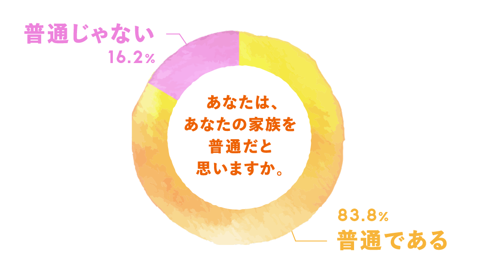 この世に全く同じ家庭など存在しないからすべての家族が普通じゃない/必要以上に沢山の経験と愛情を注いでくれる最高の家族だから。/個性が強く自己主張する/両親の仲が悪く、昔から喧嘩が多く、今では冷戦状態、円満とはいえず崩壊したため/事実婚状態だから/母子家庭だから、一人っ子だから、親戚もほとんど居ないから
