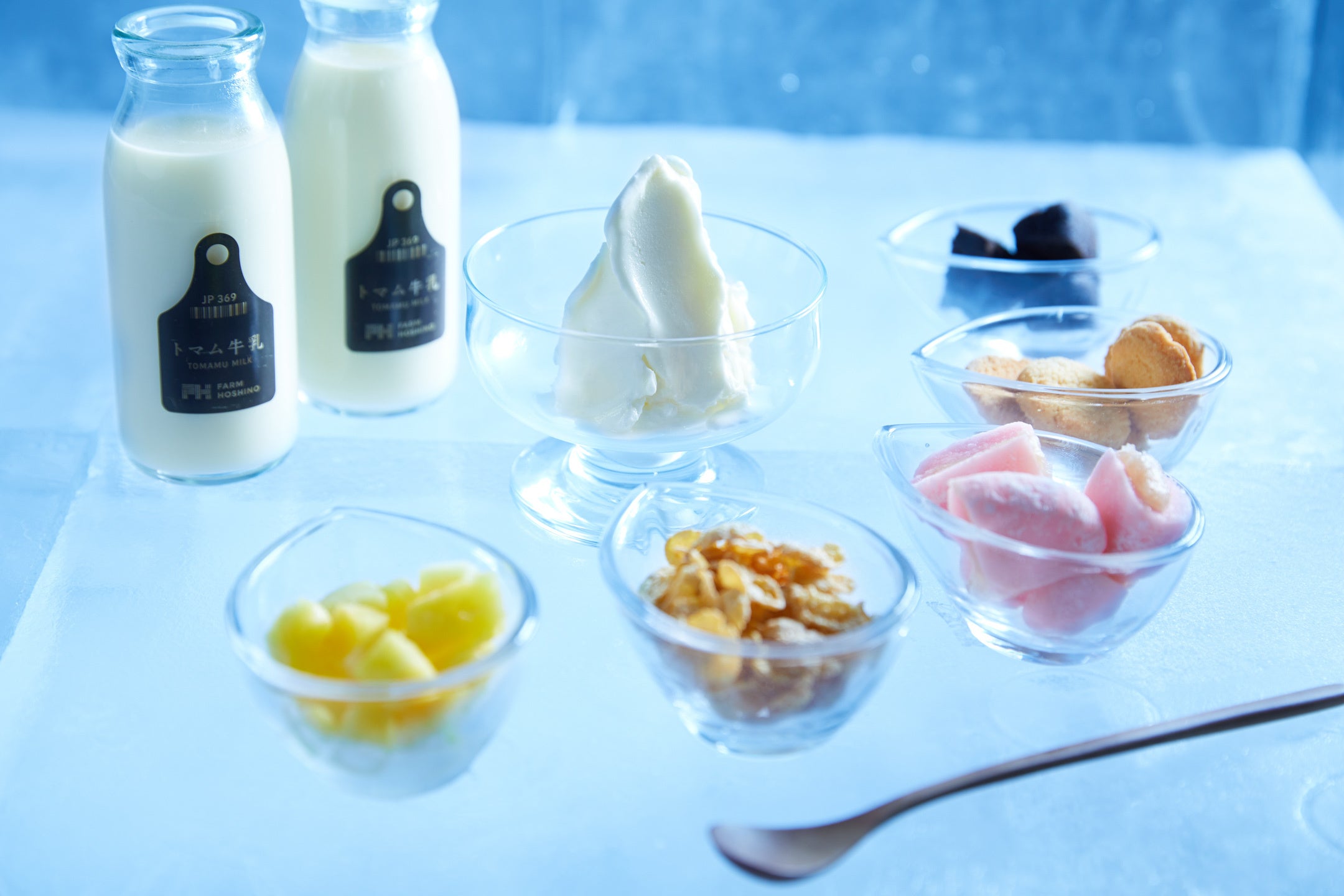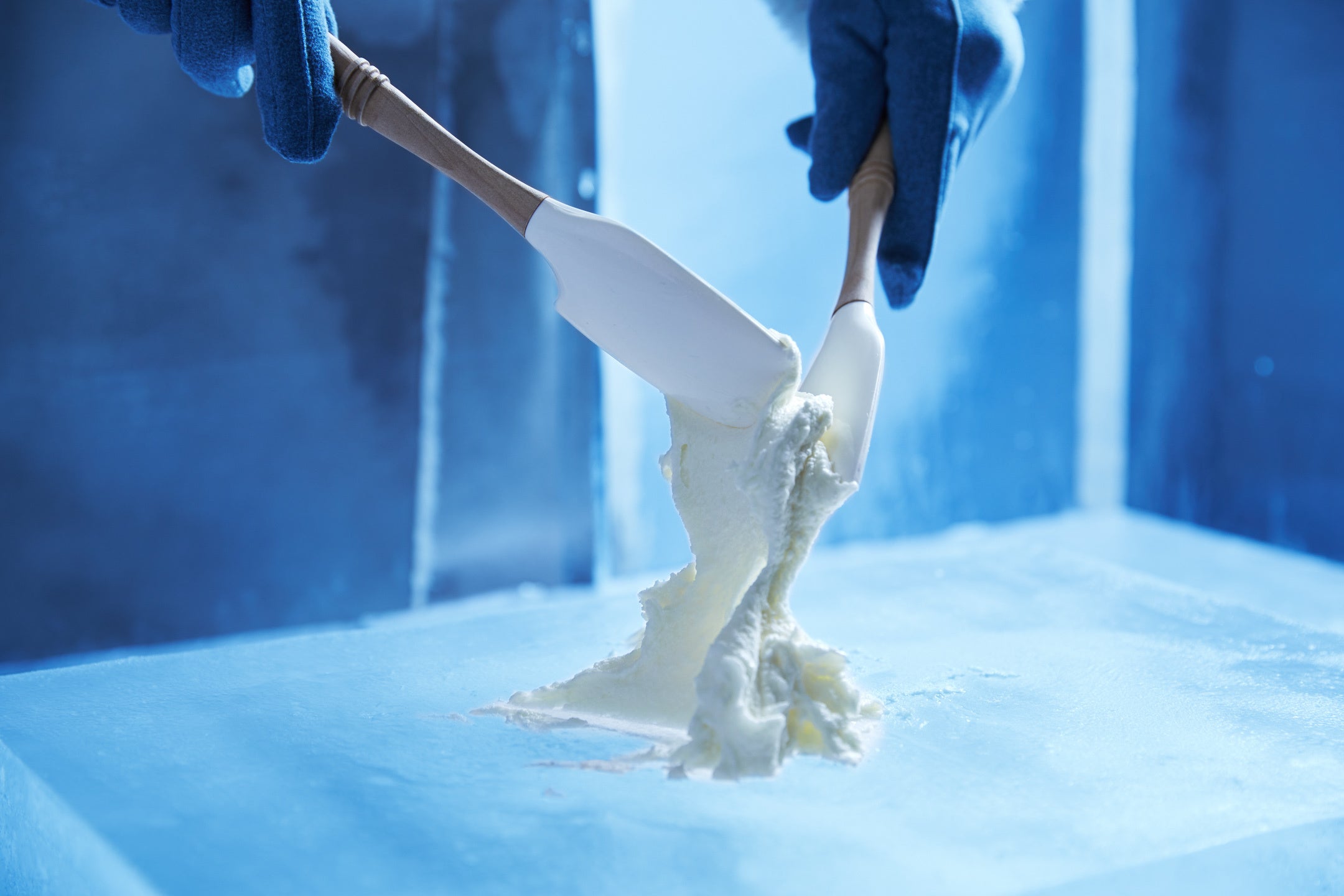 北海道で最多店舗数を有するコンビニチェーン「セイコーマート」とコラボレーションした「氷のセイコーマート」がオープン。店内では、氷のセイコーマート限定の「アイスシェフ」を楽しめます。これは、出来立てのおにぎりやお総菜を提供する「ホットシェフ」にちなんだ、アイスヴィレッジ限定の体験です。体験メニューは、ファーム星野のミルクジェラートとセイコーマートの商品を使った「ミルクジェラートづくり」。ジェラートは、ファーム星野のトマム牛乳を氷のプレート上で練り、外気温と氷の冷たさで固めて作ります。また、氷のセイコーマートに並ぶ、セイコーマートのプライベートブランド商品やカットフルーツから好みのものを選んでトッピングすることが可能。商品はその日の外気温によって凍り方が変わり、常温とは異なる食感を楽しめます。