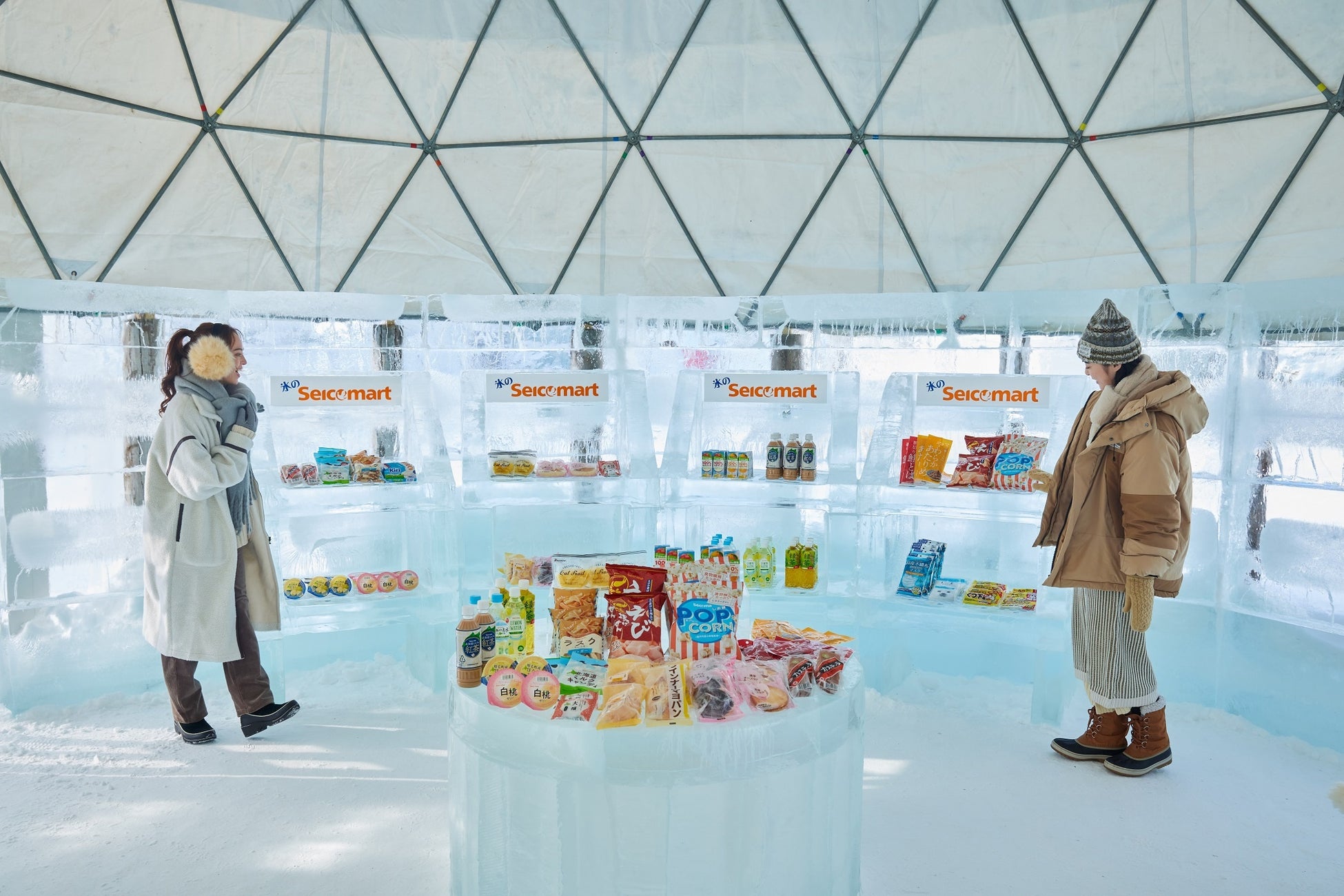セイコーマートの商品が並ぶ氷のセイコーマートが、2023~24年の冬も登場します。セイコーマートとは、北海道内で最多店舗数を有するコンビニチェーンです。星野リゾートと2022年2月1日から「旅々貯まる北海道旅プロジェクト」を開始し、最大30%お得なセイコーマートクラブ会員限定優待宿泊プランを用意。第二弾のプロジェクトとして、2022年12月10日に氷のセイコーマートがオープンしました。期間限定のお店として、好評だったことから今年も、セイコーマートのプライベートブランド商品のスナックやスイーツ、ドリンクなどを販売します。