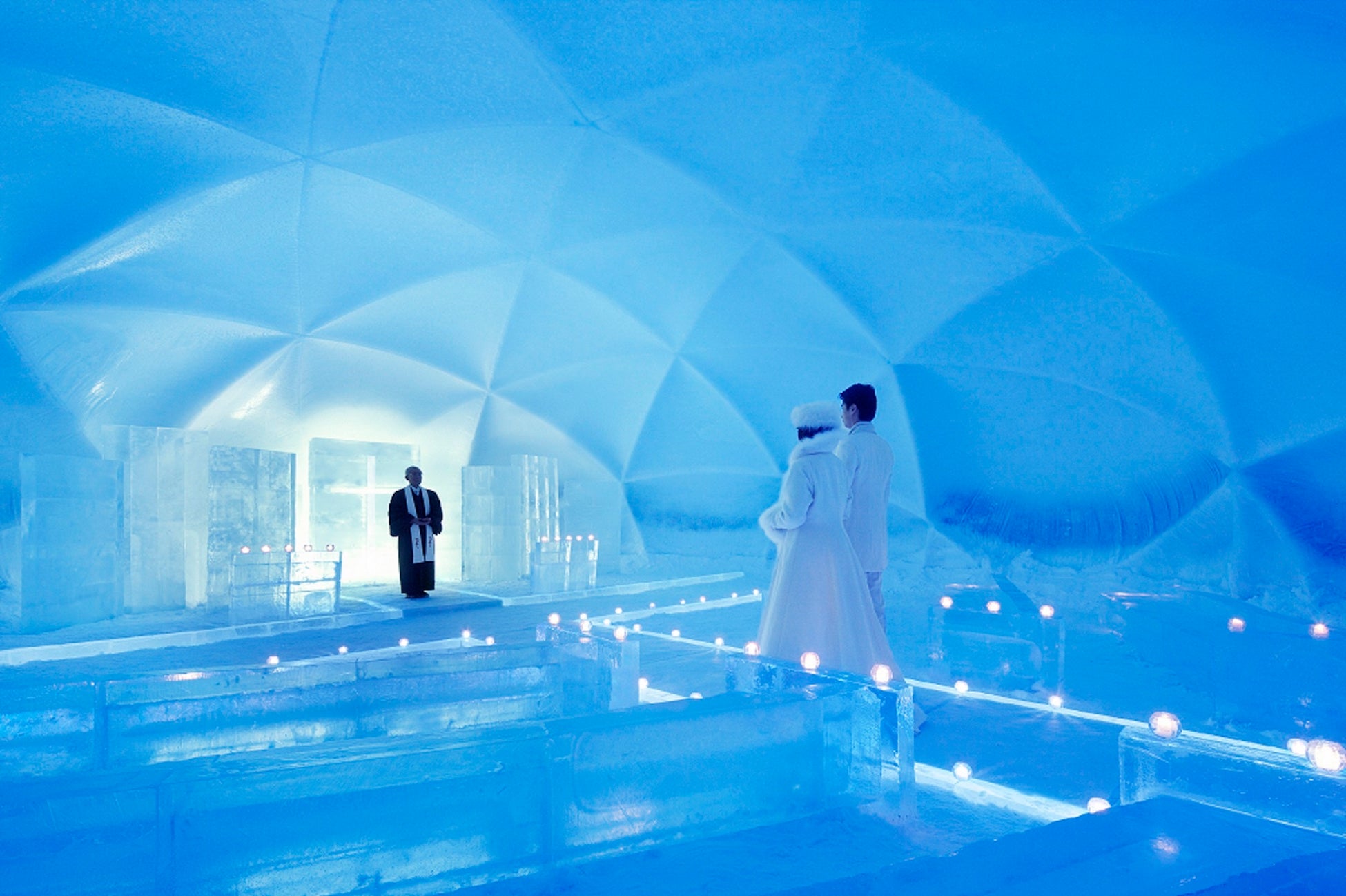 「2人の純粋な気持ちが、途切れなく続く」という想いを込め、継ぎ目のない一枚氷で造られるのが氷の教会です。祭壇や十字架、バージンロード、椅子などすべてが氷と雪でできています。