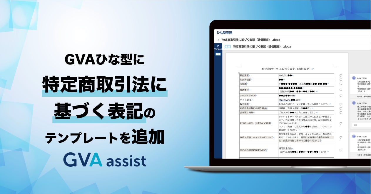 GVA TECH株式会社(本社:東京都渋谷区、代表取締役:山本 俊、以下GVA TECH)は、AI契約書レビュー支援クラウド「GVA assist(ジーヴァ アシスト)」に標準搭載しているGVA ひな型に、特定商取引法に基づく表記のテンプレートを追加したことをお知らせします。今回のアップデートにより、特定商取引法に基づく表記の作成が簡単にできるようになります。