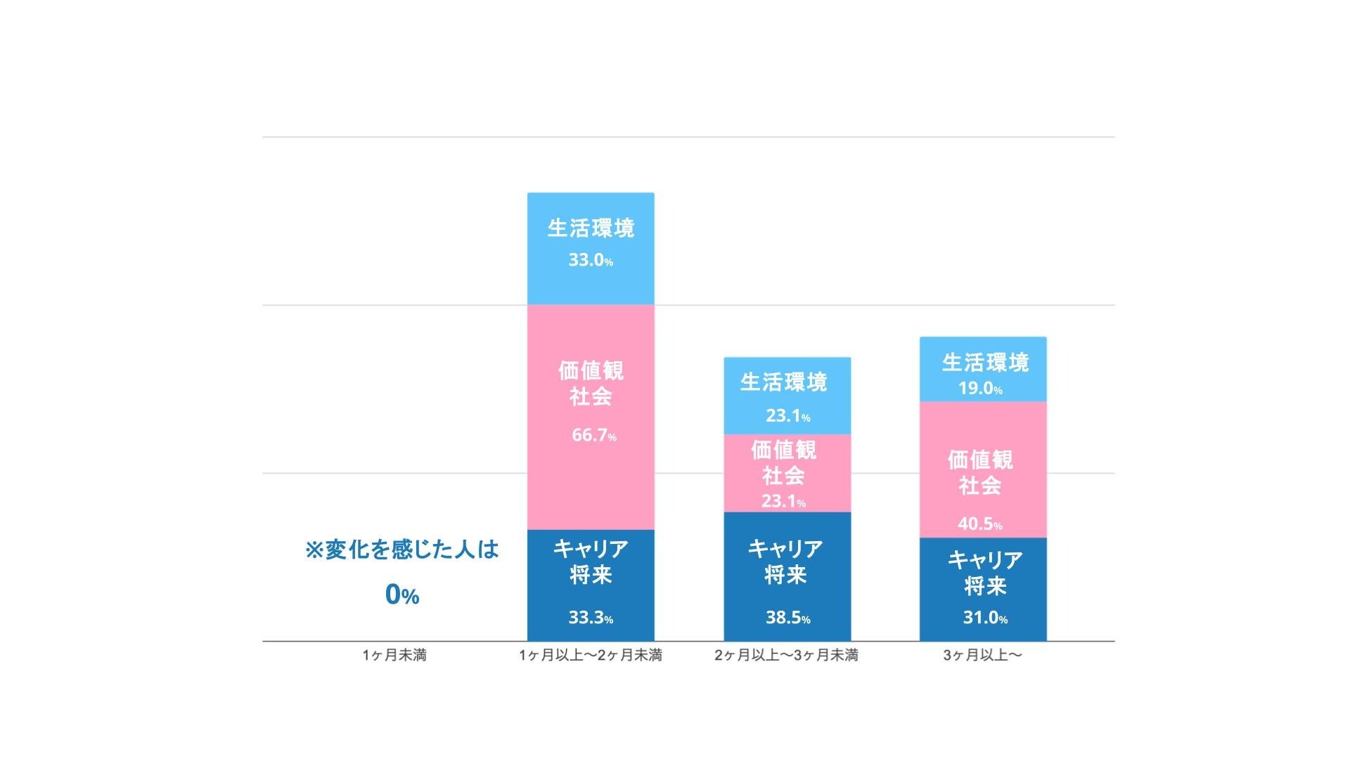その結果、1ヶ月未満ではいずれの項目も0%と変化が少ない一方で、1ヶ月以上就業した層では、価値観や社会:66.7%、キャリアや将来:33.3%と、大きな伸びを示しました。