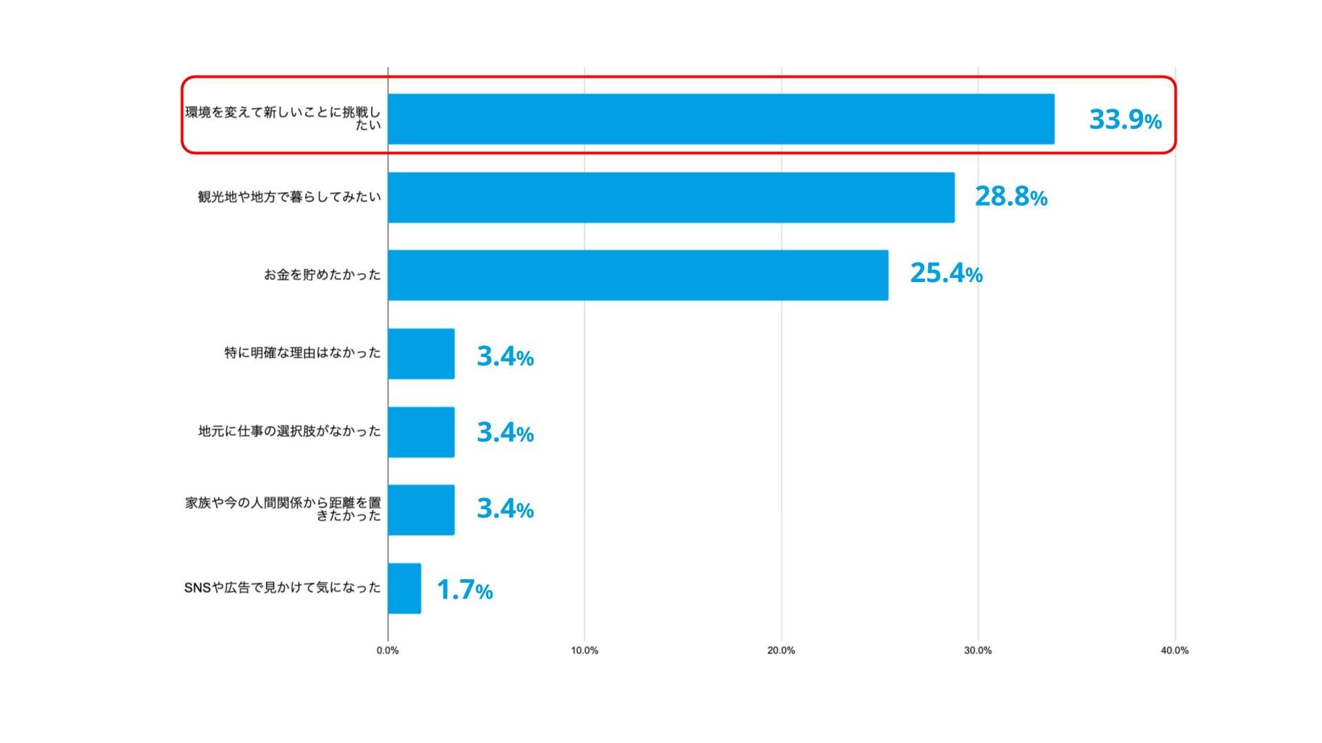 次いで「観光地や地方で暮らしてみたい」(28.8%)、「お金を貯めたかった」(25.4%)と続き、移動を通じて新しい環境や暮らしを求める前向きな動機が多く見受けられました。