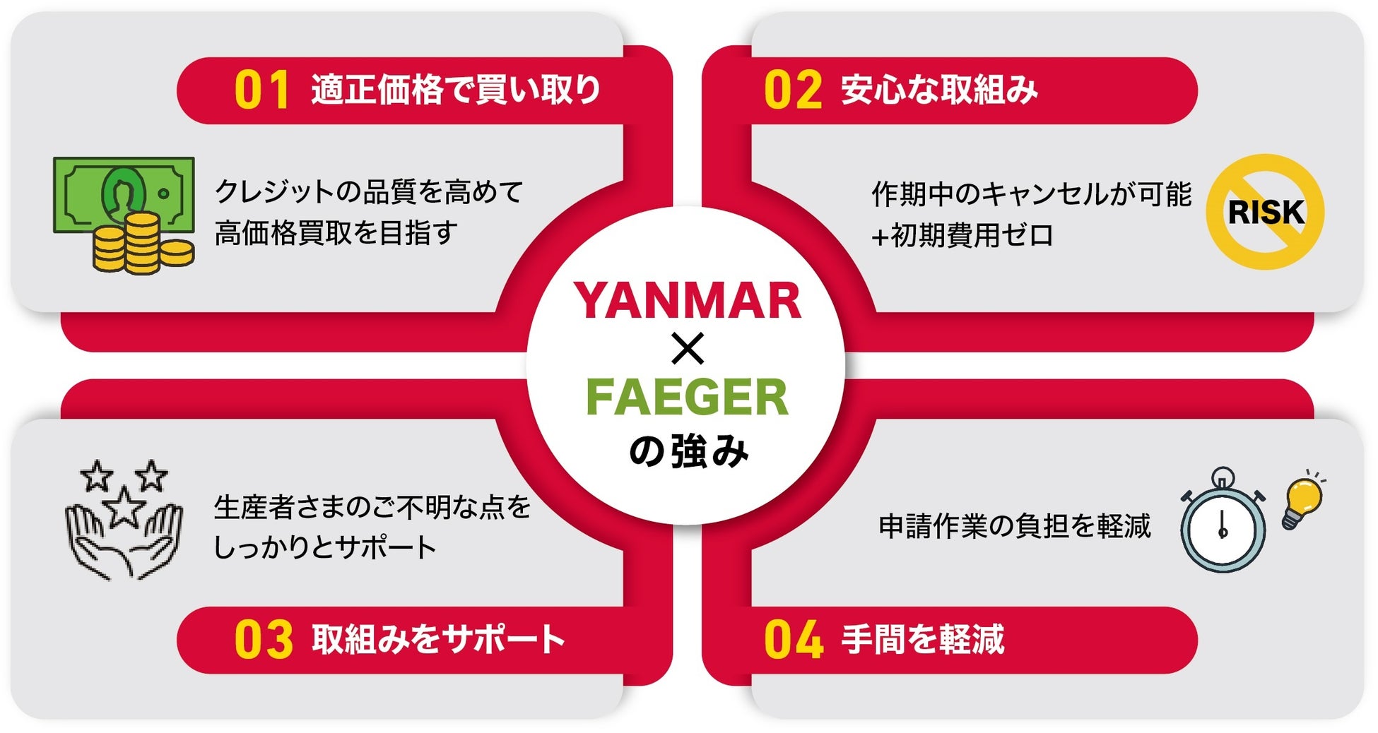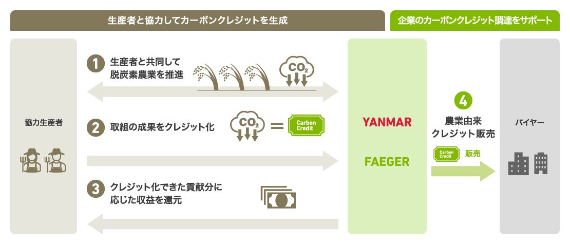 農業の脱炭素化に向けた関心が高まる中、ヤンマーAJは、フェイガー社のクレジット申請に係るサポート力や質の高いクレジット生成の実績を踏まえ、持続可能な農業の取り組みの一つとして、今回業務提携を行いました。ヤンマーAJは全国の生産者ネットワークを生かし、生産者にフェイガー社のソリューションの紹介と利用促進のプロモーション活動を行います。