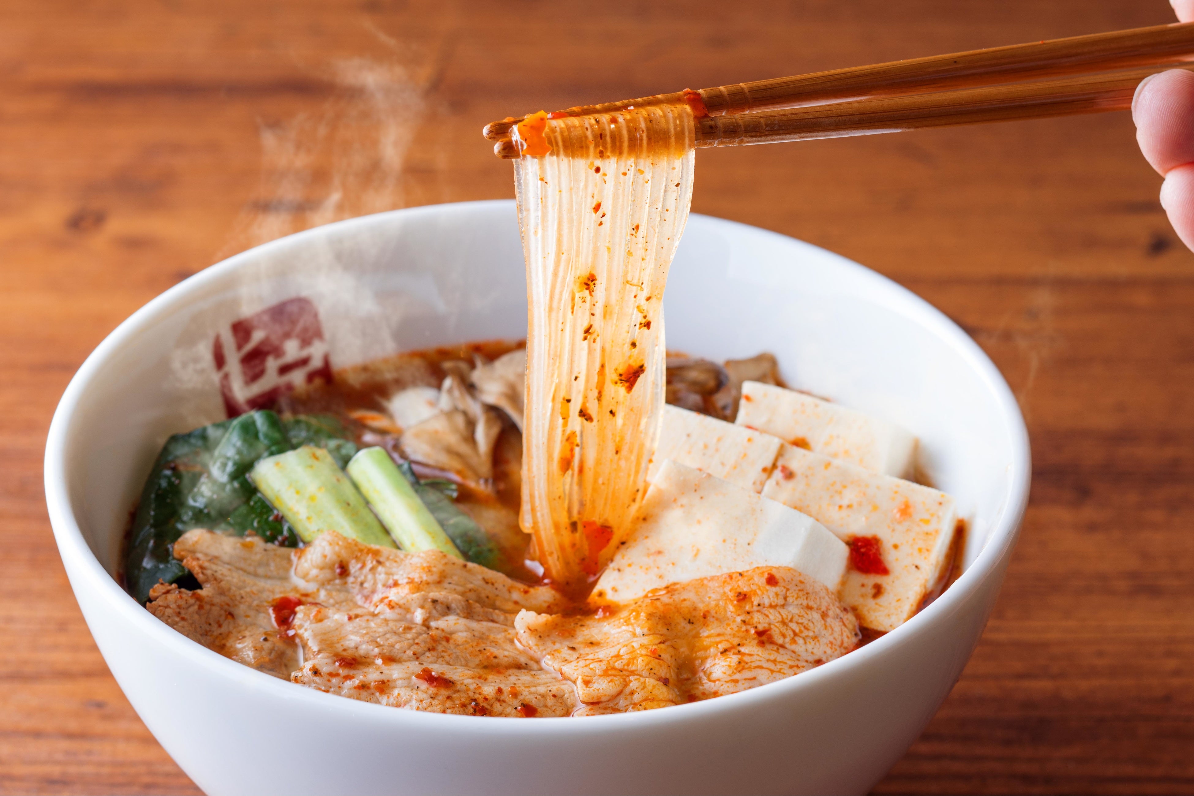 七宝麻辣湯では、30種類以上の薬膳スパイスと、鶏や豚のコラーゲンをたっぷり含んだスープを毎日丹念に仕込んでいます。春雨は鹿児島県産さつまいもと北海道じゃがいもを配合し、スープに合った麺の太さや食感を追求しました。