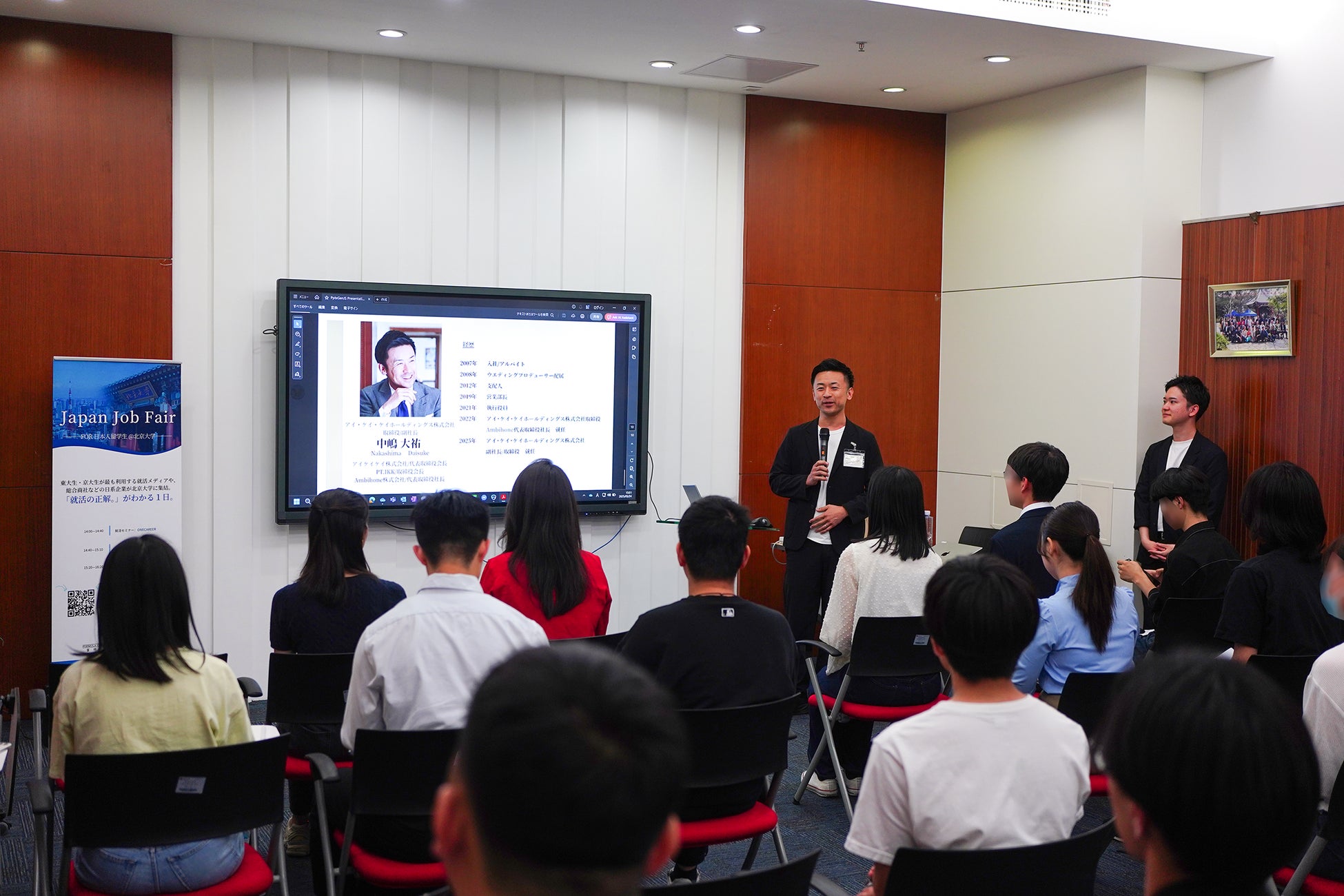 イベントは、ワンキャリア社員による就活セミナーからスタート。情報収集が成功のカギと言える就活における情報収集術や業界・企業研究の進め方、キャリアの作り方などについて参加者に解説しました。続いて、日系企業2社が登壇し、自社とその魅力について熱心にアピール。参加者は、濃密で熱のこもった説明に耳を傾け、理解を深めていました。その後、参加学生は3グループに分かれ、登壇企業と共に座談会を実施。就活の進め方やキャリア形成などについて、企業担当者と直接対話する貴重な機会となりました。学生たちは、担当者と近い距離で詳しい話を聞けたことに高い満足度を示し、就職活動の理解と意欲を一層高めることができたようです。