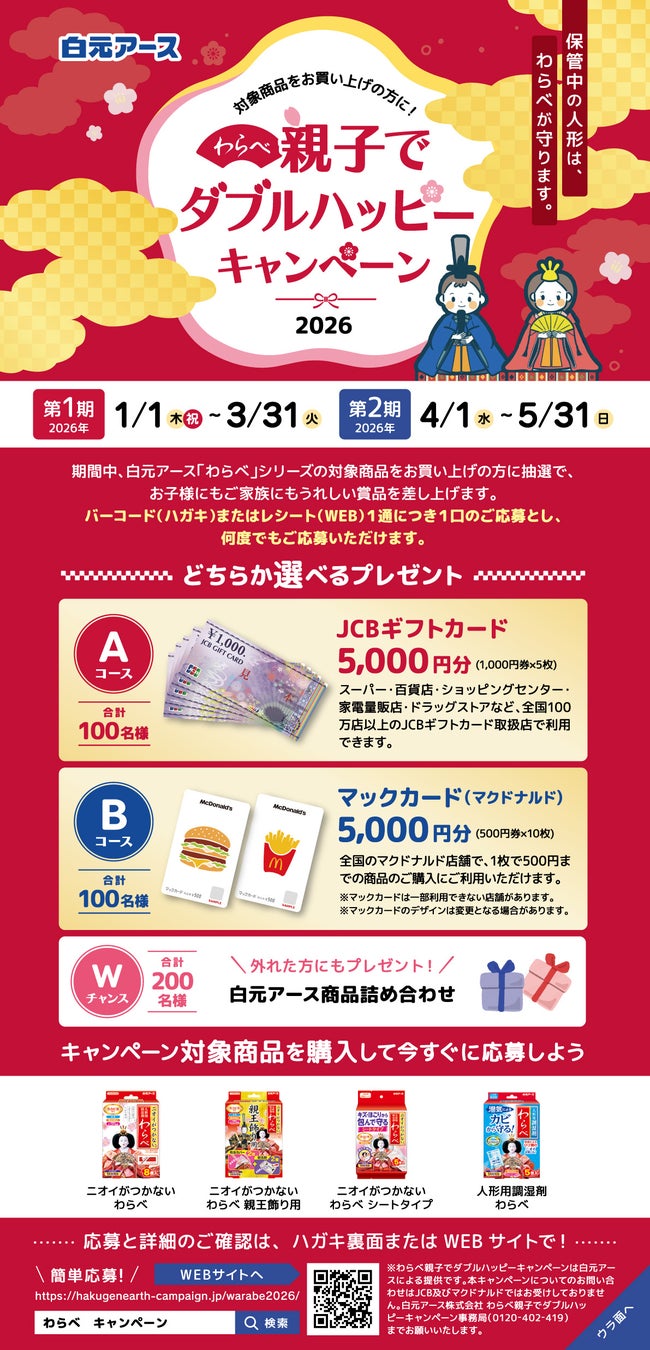 白元アース株式会社(本社:東京都足立区、社長:吉村一人)は、同社の人形用ケア商品「わらべ」シリーズを購入し応募いただくと、抽選で「JCBギフトカード5,000円分」や「マックカード(マクドナルド)5,000円分」が当たる『わらべ 親子でダブルハッピーキャンペーン2026』を2026年1月1日から実施いたします。