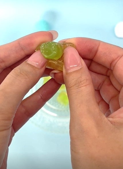 まるで凍った氷のようなキューブ型のグミを剝くと、中からクマ型のグミが出てきて食べる前から2段階の変化が楽しめます。