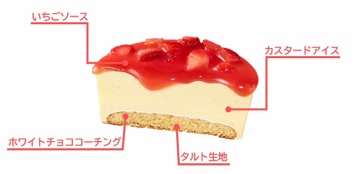 天面に広がっているいちごソースには果汁果肉49%を配合し、いちご果肉たっぷりでフレッシュないちごの味が堪能できます。濃厚なカスタードアイス、タルト生地と一緒に食べるといちごの甘酸っぱさが際立ち、まるでいちごタルトを食べているかのように感じられます。