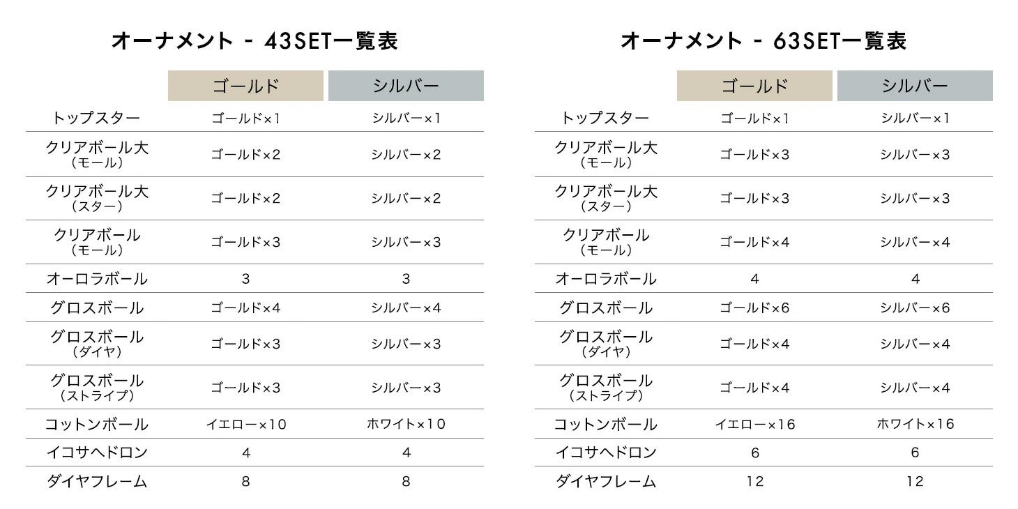 オーナメント単体で販売することにより、お手持ちのツリーでも例年とは違う雰囲気で楽しむことができ、より一層ツリーを飾る楽しみを味わうことができます。勿論、オーナメント付きのツリーに追加で本製品を飾り付けすることによりオリジナルツリーを作り、楽しむことができます。カラーはゴールドとシルバーの2色で展開しておりツリーのサイズに合わせてオーナメント量を選べるように43セットと63セットの2セットを準備しております。