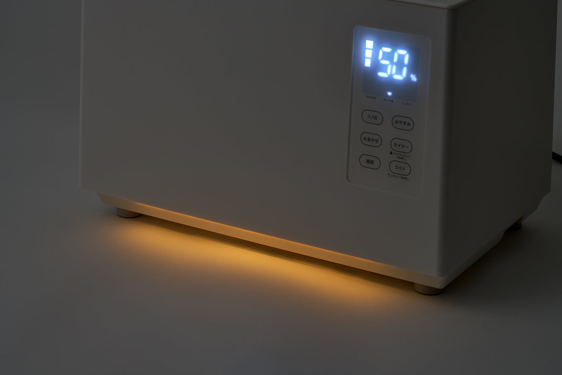 また、しっとり(70%)・かいてき(60%)・ひかえめ(50%)の3段階から設定した湿度で自動運転を行う自動モードや、2・4・6・8時間の4段階で設定できる切タイマーなど、使用シーンに合わせて使える便利な機能も搭載。さらに、アロマオイル(水性)も使用できるため、お気に入りの香りとともにお部屋をうるおすこともできます。