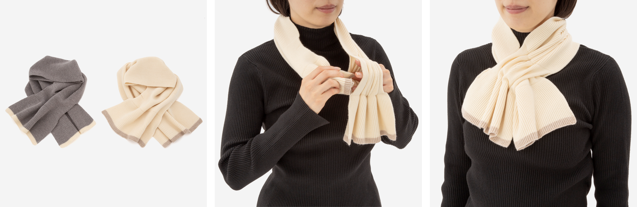 | 鏡を見なくても、穴に通すだけでサッと巻けるティペット。 忙しい朝にも便利なアイテムです。ストレッチ性のある生地は巻きやすく、より首元にフィットして温かい仕様です。ショート丈でかさばりにくいため、季節の変わり目やおうちの中での防寒対策にもおすすめです。手洗い可能で、いつでも清潔にお使いいただけます。 |