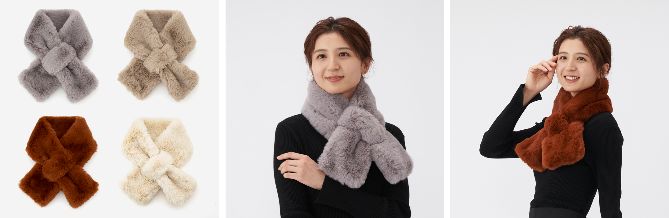 | 毎年人気の洗えるエコファーティペット。今年は両面エコファー仕様にリニューアルし、さらに温かく、ファーのふんわり感もアップしました。新色として、秋冬コーデに合わせやすく、華やかさもプラスするブラウンとアイボリーを追加。縫製には静電気防止糸を使用しています。鏡を見なくても、穴に通すだけでサッと巻けて、忙しい朝にもおすすめです。 |