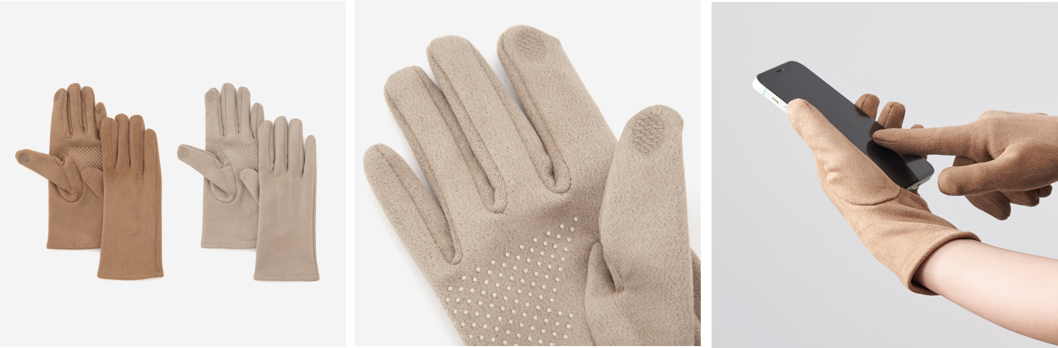 | 上品なコーディネートにも合わせやすい、フェイクスエードの洗える手袋。親指と人差し指はタッチパネル対応になっており、着用したままスマートフォンの操作ができます。手のひらに滑り止めがついているので、物を持つときに滑りにくいのも嬉しいポイント。抗菌防臭加工(※)を施しているため、いつでも清潔にお使いいただけます。 ※抗菌防臭加工は、繊維上の細菌の増殖を抑制し、汗などが原因で発生する臭いを防ぐ効果が期待できます。病気の治療や予防を目的とするものではありません。 |